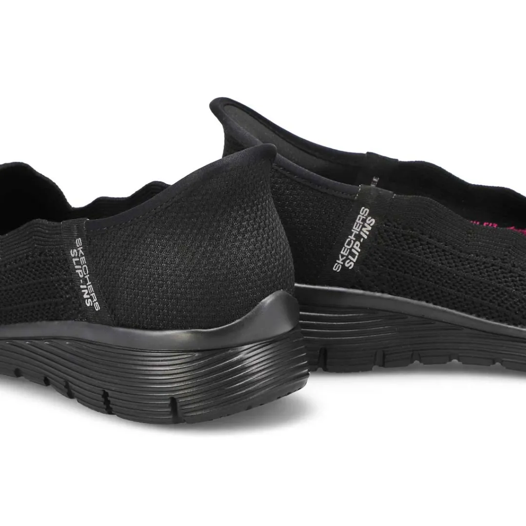 Make the call for sleek and versatile comfort in Skechers Hands Free Slip-ins Seager black /black shoe. Designed with Skechers Exclusive Heel Pillow to help hold your foot securely in place. This casual style features a Stretch Fit engineered knit upper with scalloped trim and a cushioned Skechers Air-Cooled Memory Foam insole.