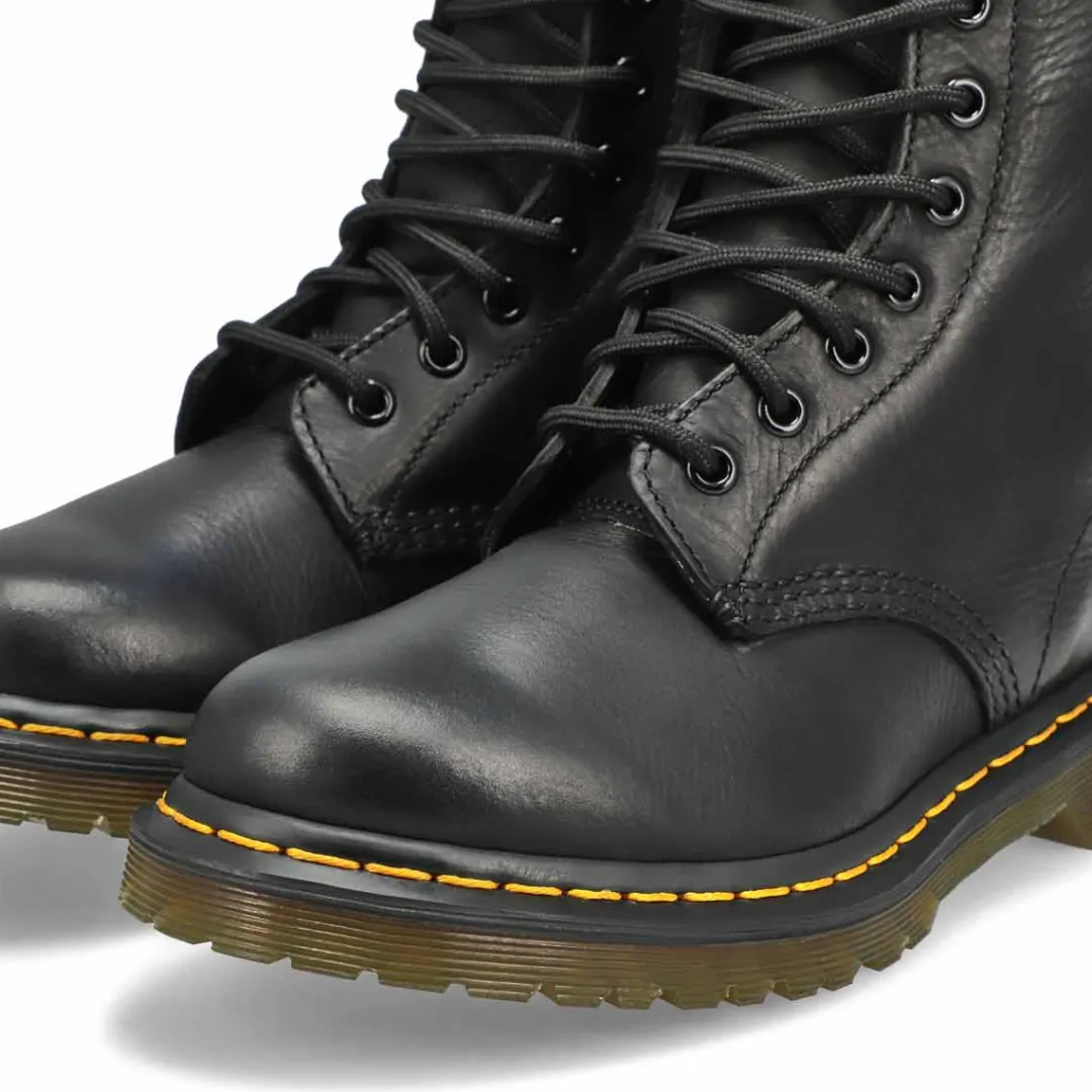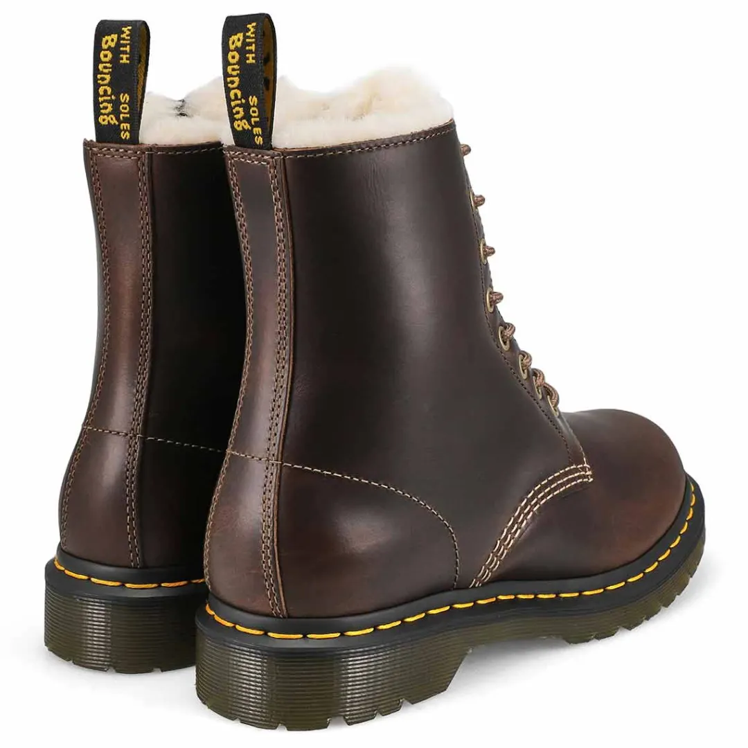 Made to keep your feet comfortable, the Serena 8 eye nickel grey faux fur lined boots from Dr. Martens are designed with a Goodyear welt construction where the upper and sole are heat-sealed and sewn together with the classic Z-welt stitching for long-lasting durability and flexibility. Lightly cushioned leather and textile insole for all-day comfort. Dr. Martens’ original air-cushioned outsole is slip, oil, and abrasion resistant. It also features a classic grooved sole pattern.