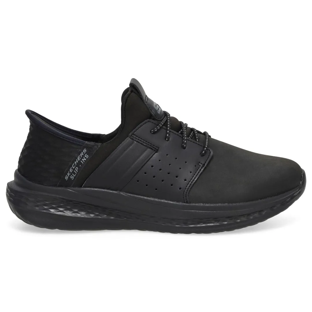 Sleek athletic style arrives with signature comfort in the Slip-ins Relaxed Fit: Slade Zachary casual shoe from Skechers. Designed with Skechers’ Exclusive Heel Pillow, this stretch-laced style features a leather and synthetic upper with a charcoal-infused Skechers Air-Cooled Memory Foam insole and Skechers Goga Mat Arch cushioning. Wide Width