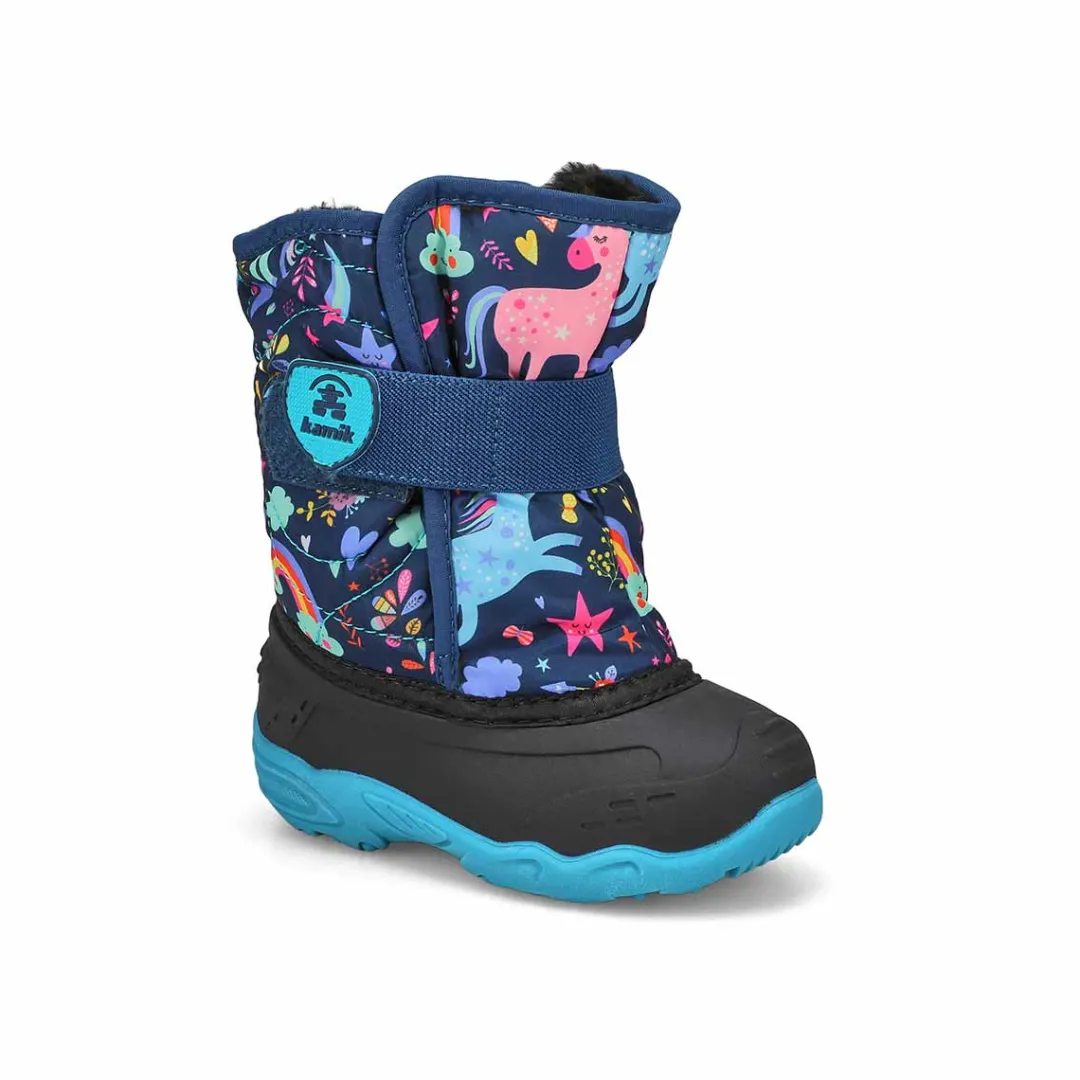 Make every wintry outing a magical adventure for your curious little snow bunny! Cozy down to -23°C and vegan-friendly, our Snowbug 6 winter boots feature a waterproof nylon upper and easy-on wide opening with adjustable elastic strap. The soft faux fur insulation, along with a moisture-wicking faux fur lining, ensure their feet stay toasty. The lightweight rubber shell and deep-tread sole help to keep little ones steady as they frolic in the flurries. These boots also feature a fun print that your mini fashionistas are sure to love!