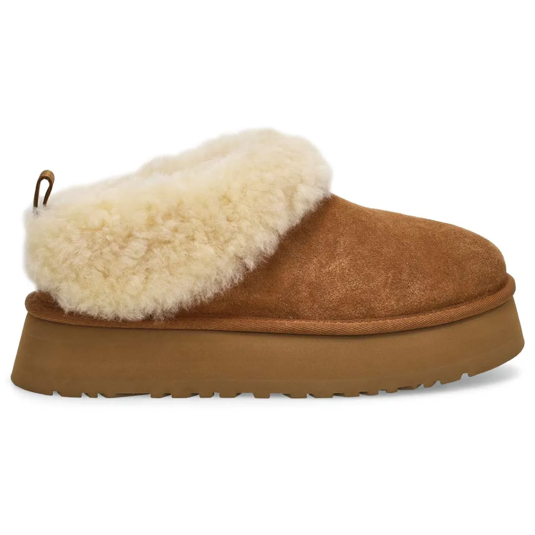 Love the Tazz but want even more UGG coziness? The Tazzelle chestnut platform slipper is the one for you. This ultra-plush indoor-outdoor slipper features genuine suede and a lightweight 1.75 inch platform made from springy sugarcane EVA. Sheepskin lines the interior and continues onto the lush fixed cuff, so you can wear these with socks, or without.