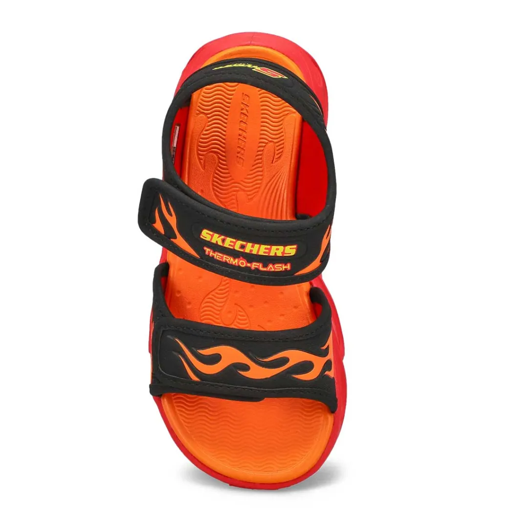 Stay cool in fiery style with the Thermo Splash black/ red sandals from Skechers. This fiery themed light-up sporty sandal features a synthetic upper with a hook and loop closure and a cushioned midsole. Fiery themed river sandal design. .Sculpted flame light-up midsole. The Thermo Splash is designed with a flexible traction outsole.