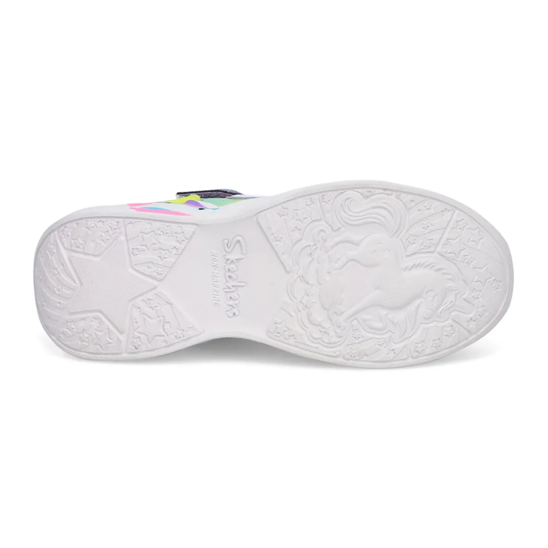 Brighten up your day with a little unicorn magic wearing the Unicorn Dreams purple /multi shoe from Skechers. This light-up sneaker features an ombre synthetic upper with a glitter finish and a cushioned comfort insole. Bungee-laced front with hook and loop closure. Air Cooled Memory Foam cushioned comfort insole. Skechers Magical Collection logo detail.
