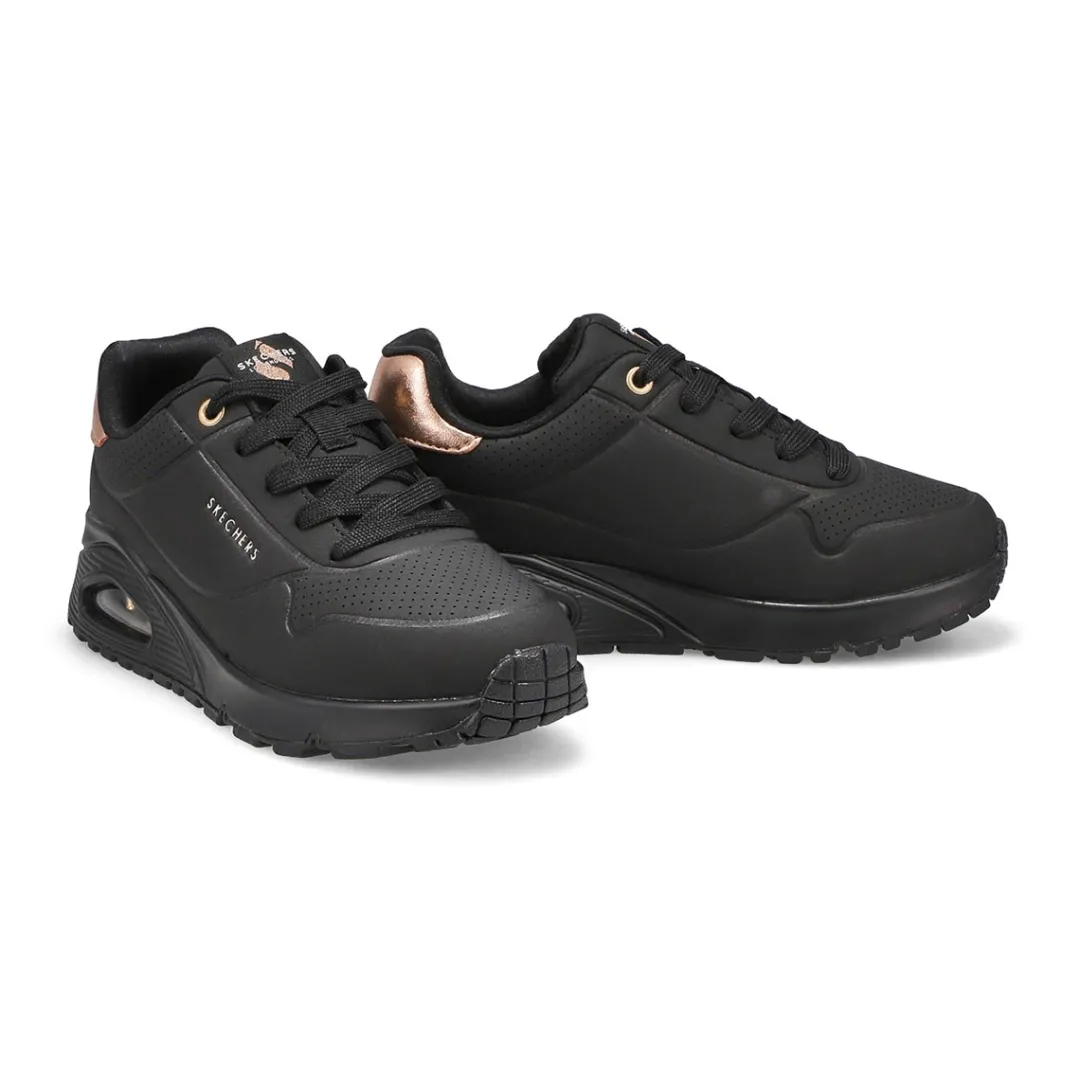 Your little one will turn heads with a bright statement wearing the Uno Gen 1 white lace up sneaker from Skechers. This fashion style comes in lace up styling for a secure fit, the perfect complement to summer wardrobes. Featuring a smooth perforated synthetic upper with an Air-Cooled Memory Foam insole, and a visible Skech-Air air-cushioned midsole.