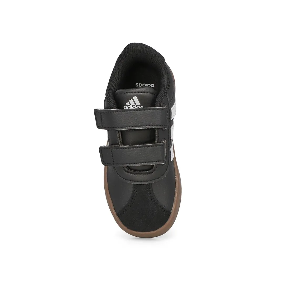 These infants’ Adidas VL Court 3.0 CF black/white/black sneakers are made for toddlers on the move. Whether they’re cruising on their first balance bike or exploring every inch of the playground, these skater-style kicks are the perfect choice. A faux leather upper with a soft suede toe cap offers durability and style, while hook-and-loop straps make these shoes easy to slip off when naptime arrives.