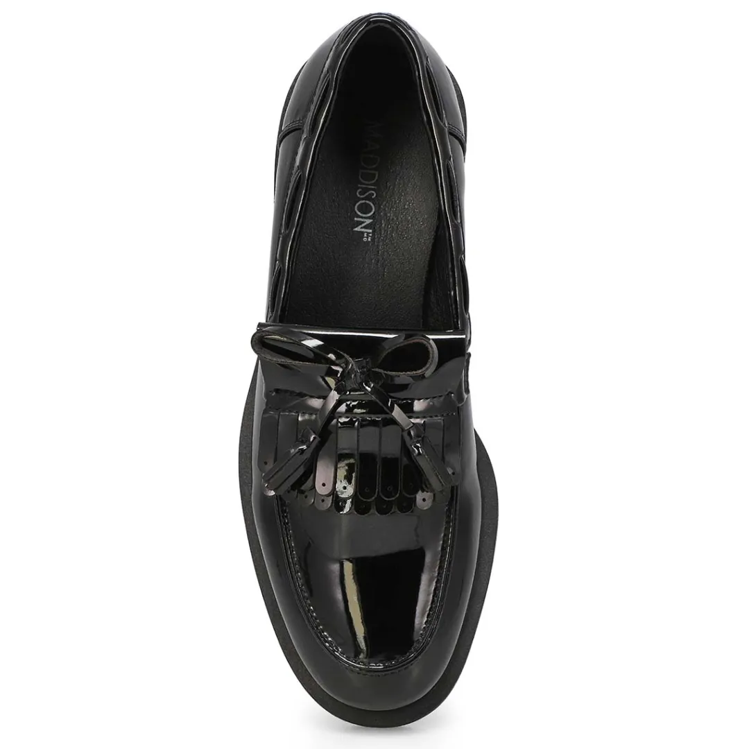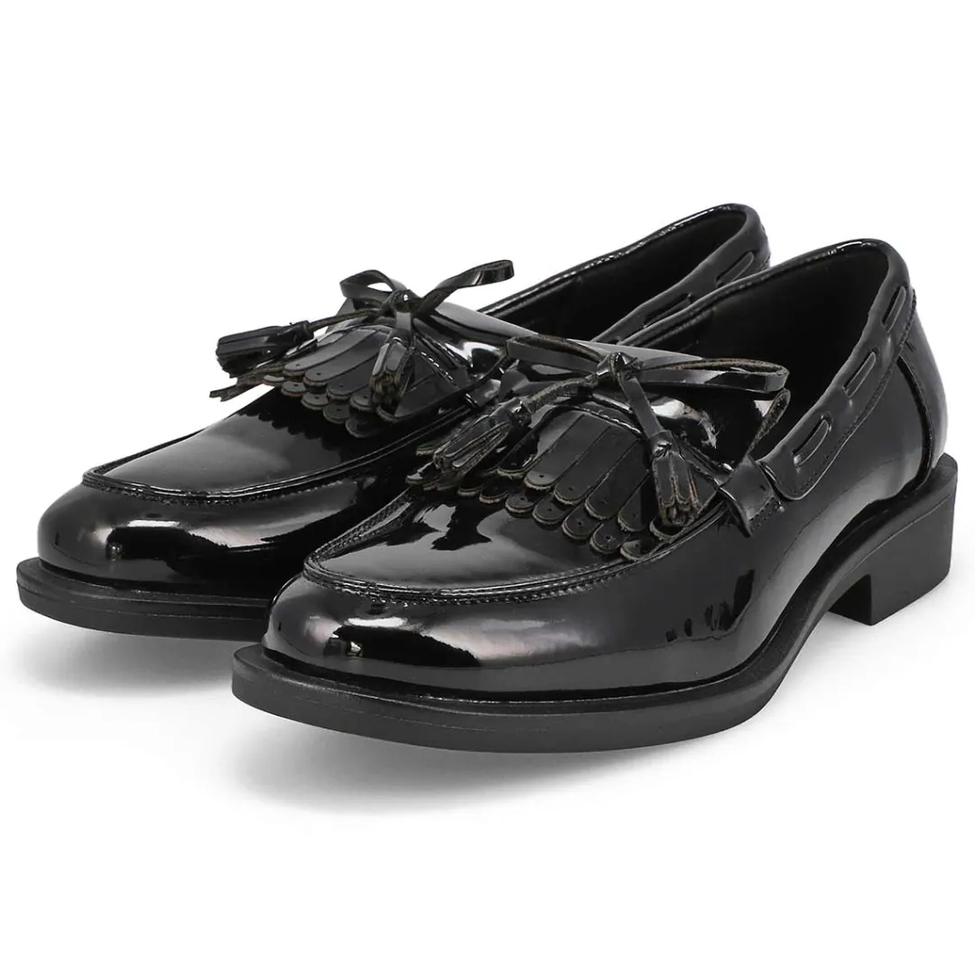 Step outside in style! These classy and comfy black patent shawl loafers are easy to wear and very versatile. You can easily dress up a casual look with these. Decorative detailing, including a bow and some added flare with the fringe. Cemented durable construction for every day use. Slip into these and you won’t be sorry.