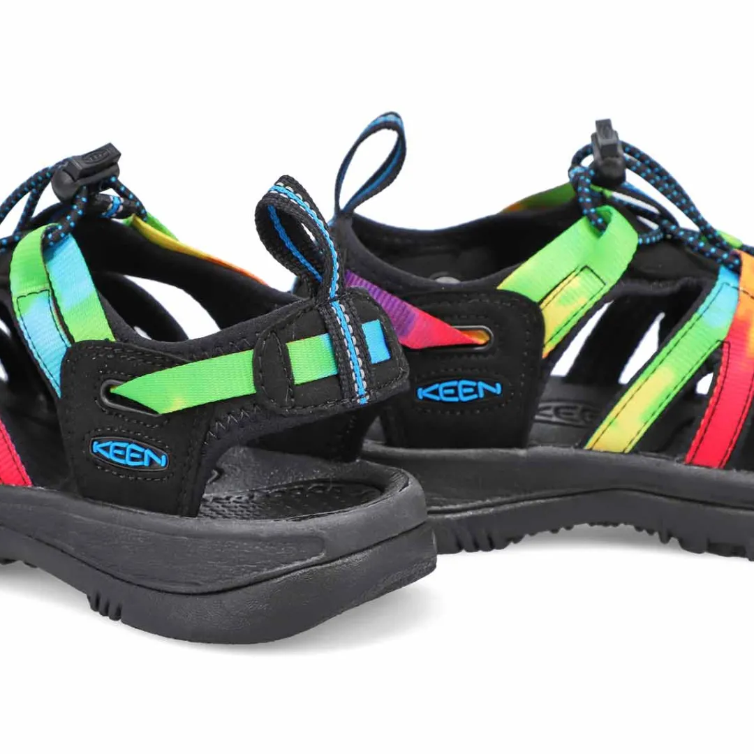 The Whisper tie dye is a water-friendly sandal from Keen that’s perfect for any adventures. Featuring a washable polyester webbing with a quick draw elastic lacing system. Aegis Microbe Shield treatment. Compression molded EVA midsole with a metatomical EVA footbed. The Whisper sport sandal is designed with a patented Keen toe protection and a non-marking rubber outsole with great traction.