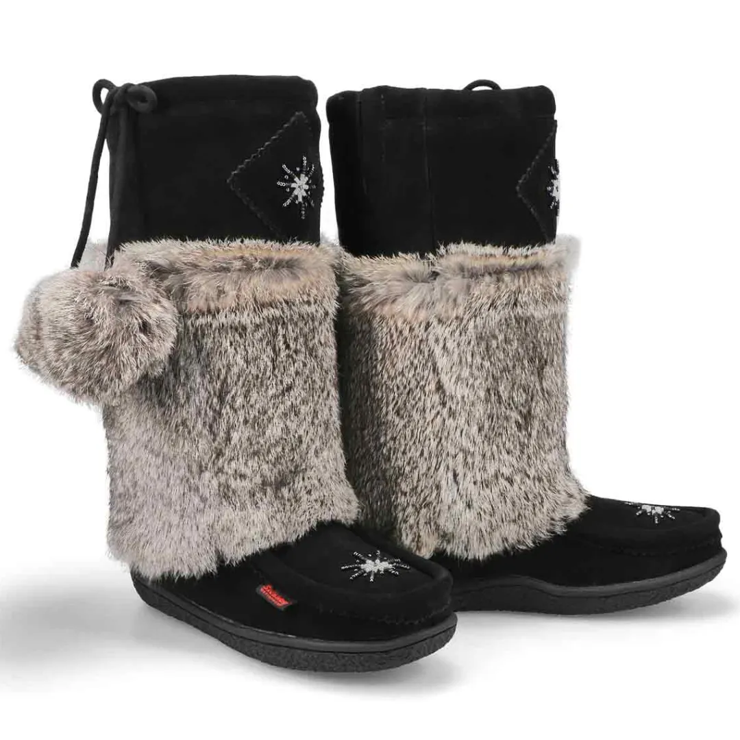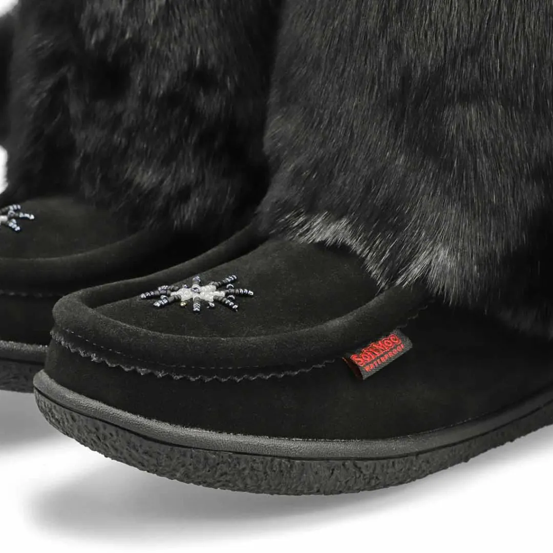 The Winter Niska 2 black/ black waterproof SoftMocs from SoftMoc is back ! Same beautiful suede upper with rabbit fur. This boot has a waterproof membrane lining for all Canadian weather elements. Fleece lined for added warmth and comfort. TPR outsole. Beautiful and intricate hand sewn beading on the toe and front shaft of the boot.