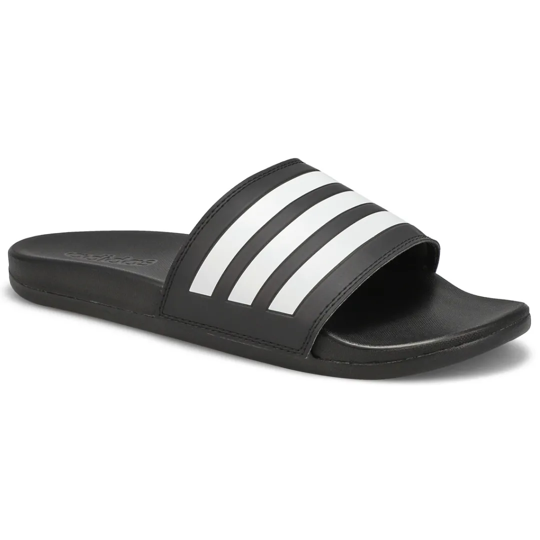From the beach to the street. These slip-on slides have a pillow-like cushioned footbed for optimal comfort. The bandage-style upper offers a lightweight feel. Features a synthetic upper with a quick dry lining. Slip-on construction in a contoured Cloudfoam Plus footbed. Lightweight EVA outsole. Make the Adilette black/ black sport slide from Adidas part of your must-have wardrobe this season!