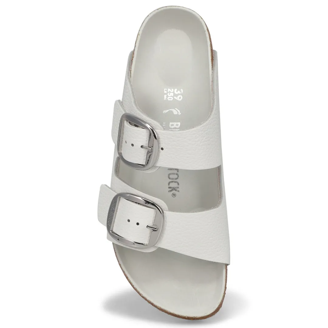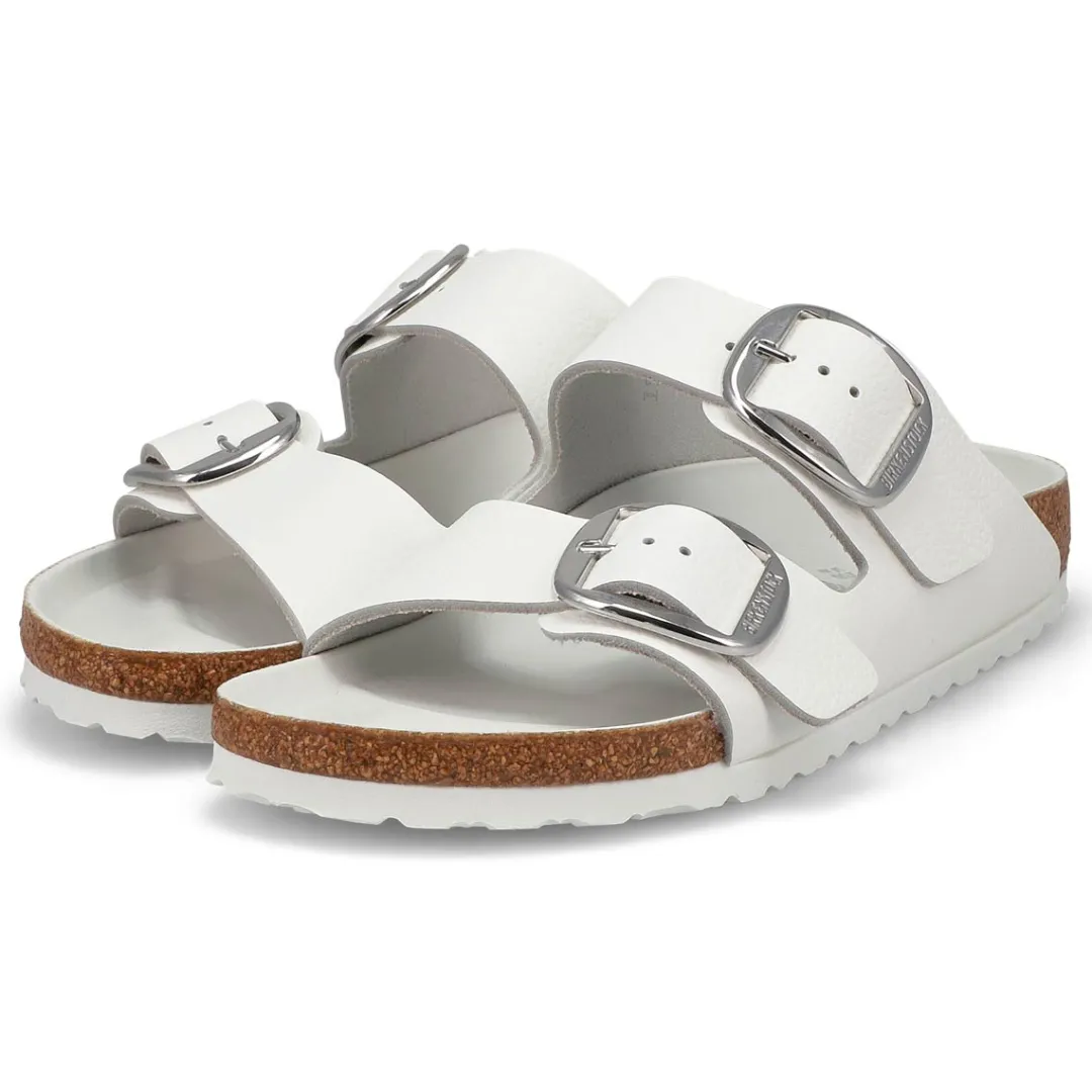 The Arizona Big Buckle white leather 2 strap upper from Birkenstock is designed with a cushioned orthotic footbed provides excellent arch and metatarsal support. Durable EVA outsole, cork footbed molds to each individual foot to provide a custom fit. This Birkenstock sandal is a genuine classic, emphasizing the handcrafted and natural look of stylish sandals. A comfort legend and a fashion staple.