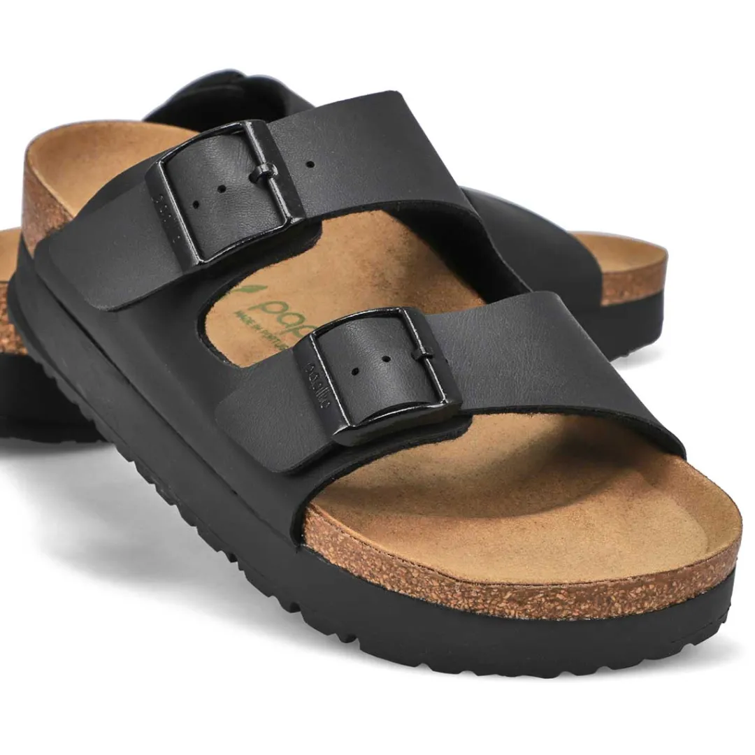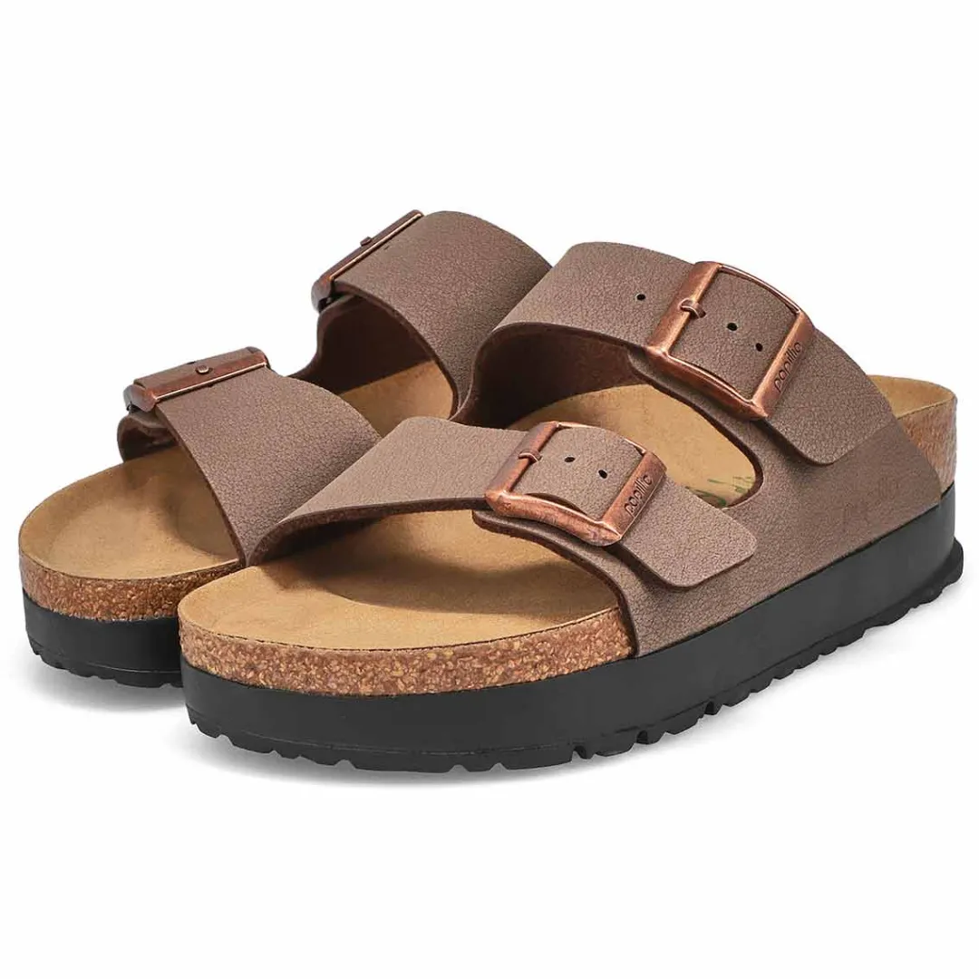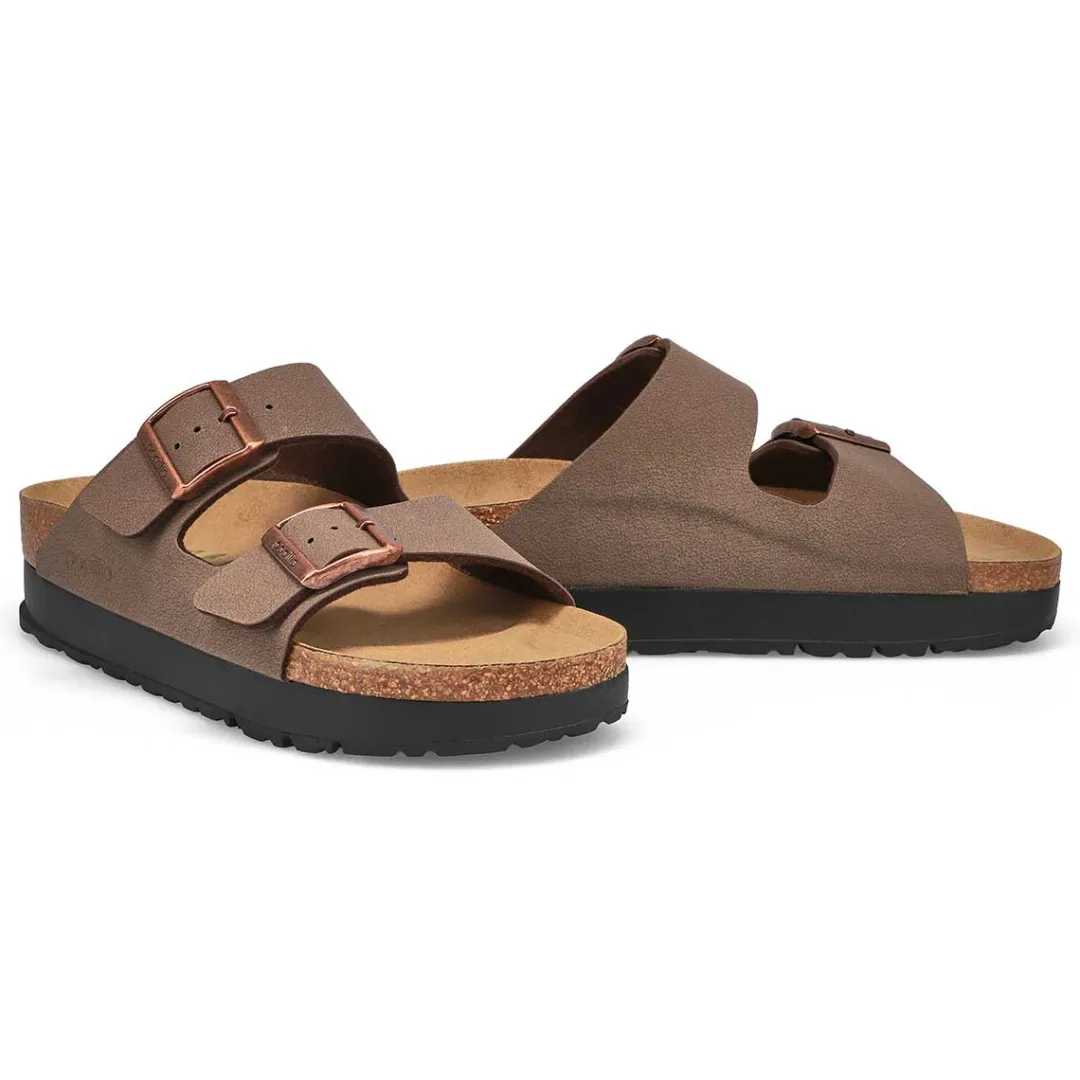 The Arizona Vegan Narrow Platform mocha 2 strap upper from Birkenstock with a cushioned orthotic footbed provides excellent arch support. Durable EVA outsole, cork footbed molds to each individual foot to provide a custom fit. This Birkenstock sandal is a genuine classic, emphasizing the handcrafted and natural look of stylish sandals. A comfort legend and a fashion staple.