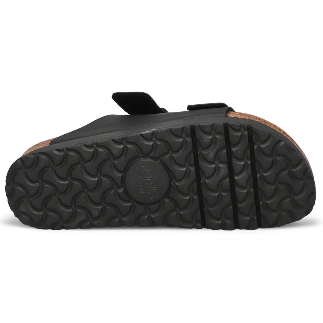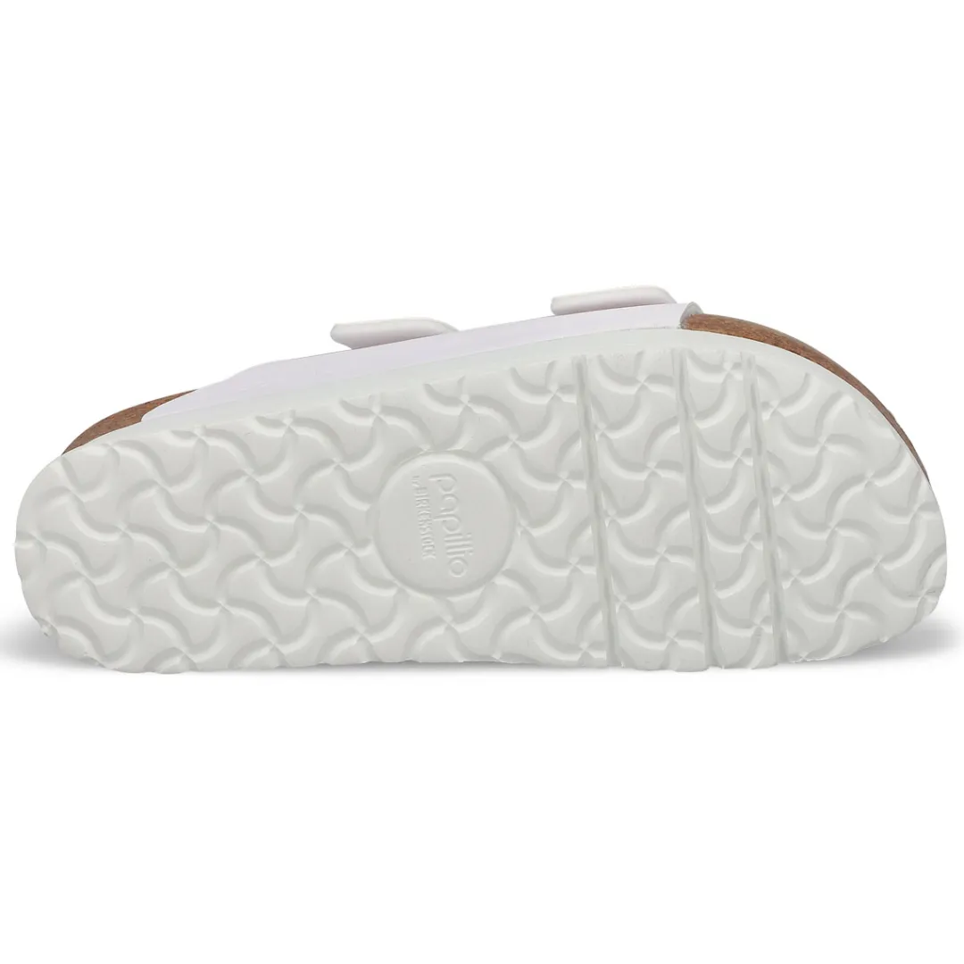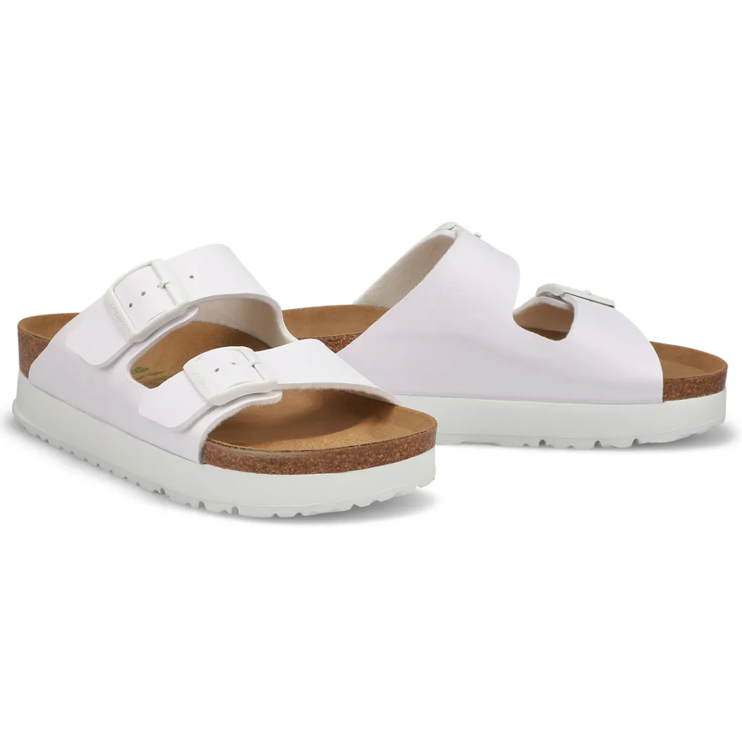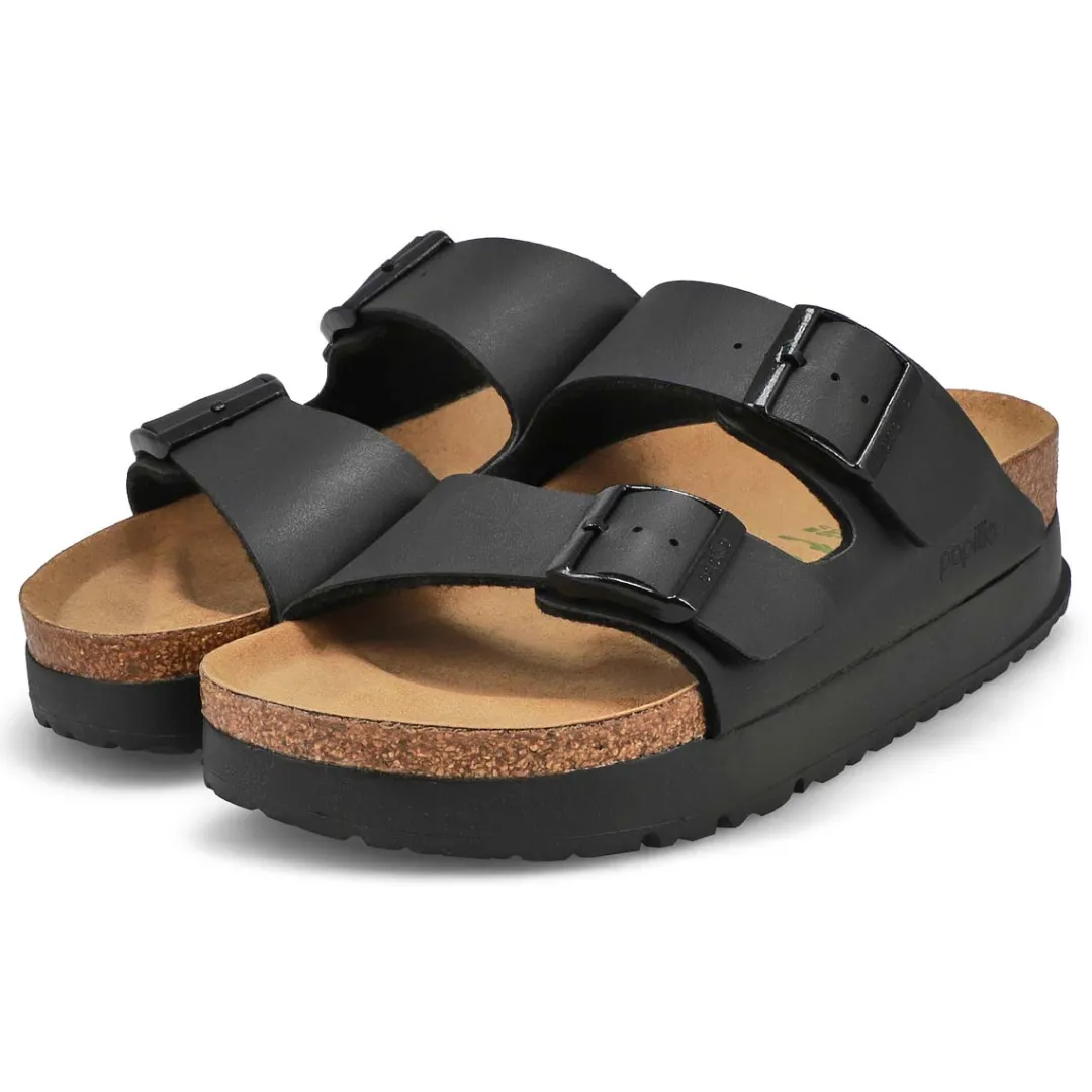 The Arizona Vegan Narrow Platform mocha 2 strap upper from Birkenstock with a cushioned orthotic footbed provides excellent arch support. Durable EVA outsole, cork footbed molds to each individual foot to provide a custom fit. This Birkenstock sandal is a genuine classic, emphasizing the handcrafted and natural look of stylish sandals. A comfort legend and a fashion staple.