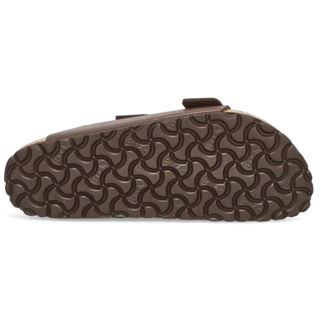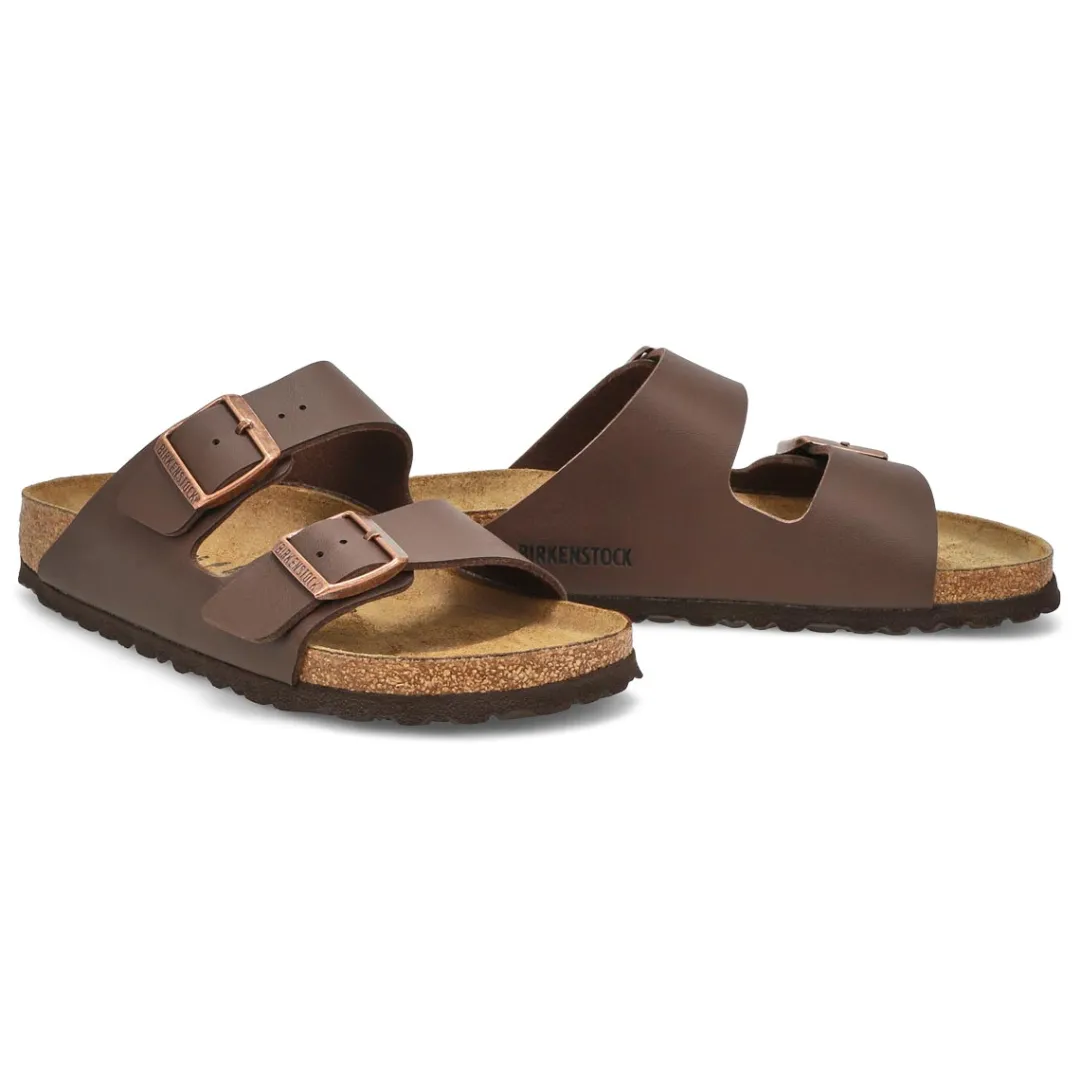 The Arizona Birko-Flor narrow width brown 2 strap from Birkenstock with a cushioned Contoured cork footbed conforms to the shape of your foot and features pronounced arch support. Durable EVA outsole, cork footbed molds to each individual foot to provide a custom fit. This Birkenstock sandal is a genuine classic, emphasizing the handcrafted and natural look of stylish sandals. A comfort legend and a fashion staple.