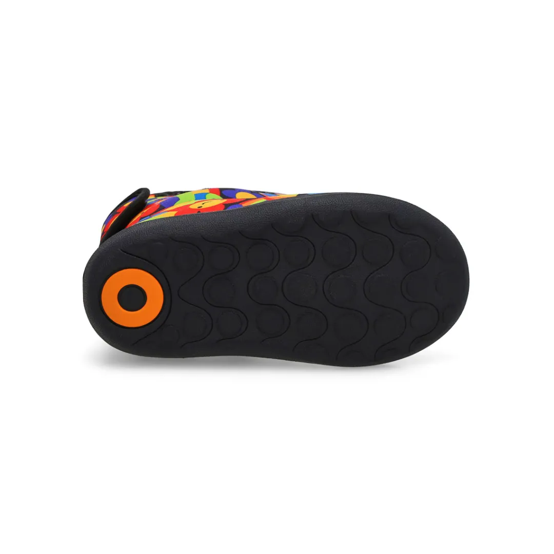 Introduce little ones to the great outdoors. These Baby Bogs II Jurassic Dino waterproof black/ multi from Bogs will keep your little one warm and dry in damp, chilly weather with a waterproof build and Neo-Tech insulation. Fuzzy plush lining adds an extra snuggly feel, and a hook-and-loop strap makes them simple to get on and off.