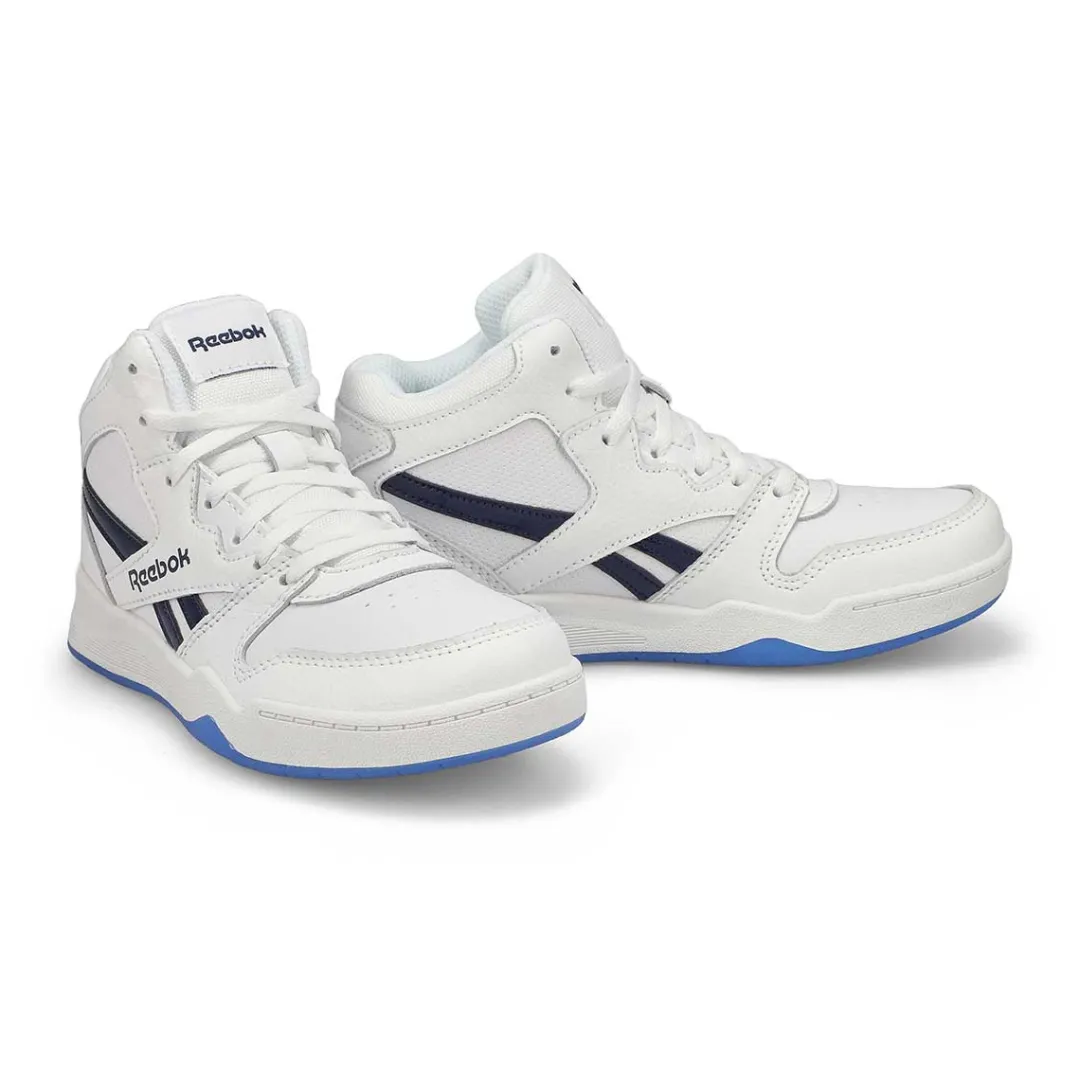 Vintage B-ball vibes for the win. Get all the glory when you lace up the BB4500 Court white/ navy/ ice Hi Strap sneaker from Reebok. Solid OG design is all yours with an extra splash of modern style. Featuring a genuine leather upper with textile lining. Lace closure with hook and loop strap. Designed with a durable rubber outsole.