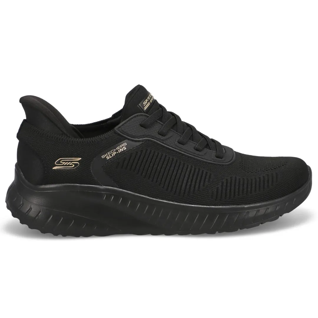 Step into athletic style and comfort wearing the Hands Free Slip-ins: BOBS Sport Squad dark navy Sneaker from Skechers. Designed with Skechers’ Exclusive Heel Pillow that helps hold your foot securely in place. This fashion style features an engineered knit upper with stretch laces and a cushioned Skechers Memory Foam comfort insole.