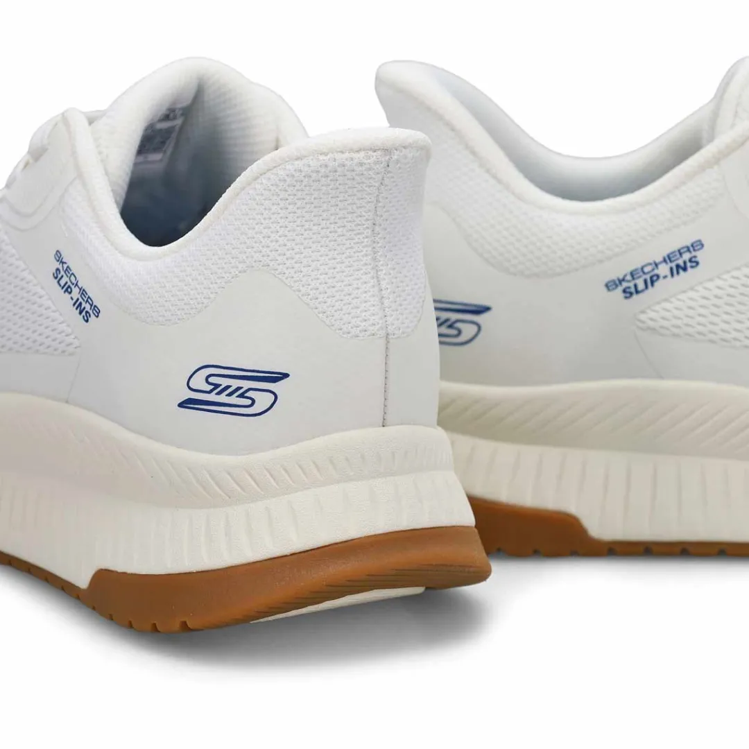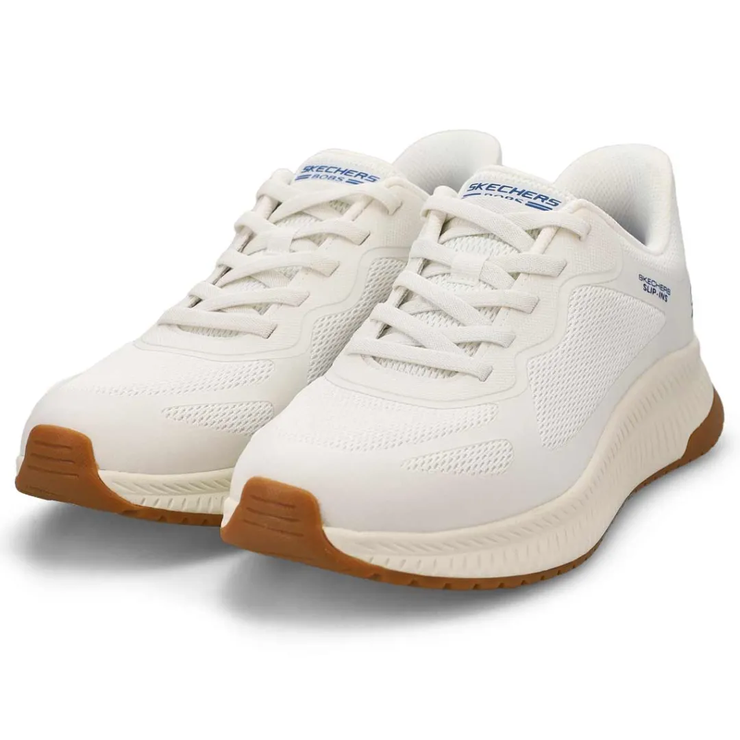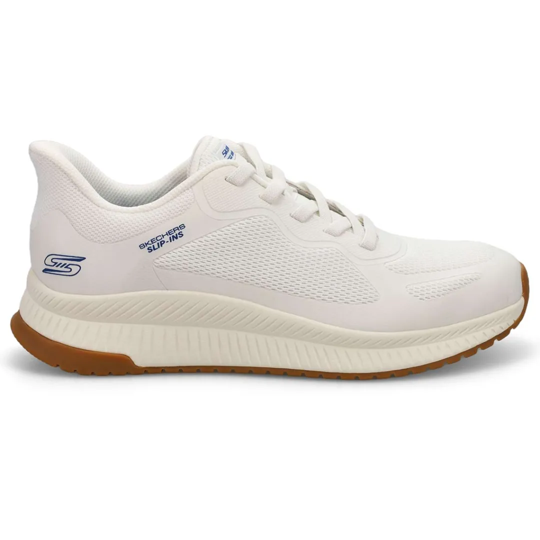 Step into athletic style and comfort wearing the Hands Free Slip-ins: BOBS Sport Squad white Sneaker from Skechers. Designed with Skechers’ Exclusive Heel Pillow that helps hold your foot securely in place. This fashion style features an engineered knit upper with stretch laces and a cushioned Skechers Memory Foam comfort insole.