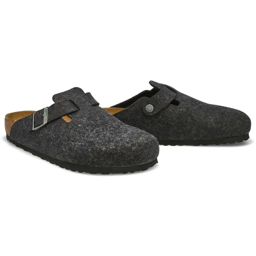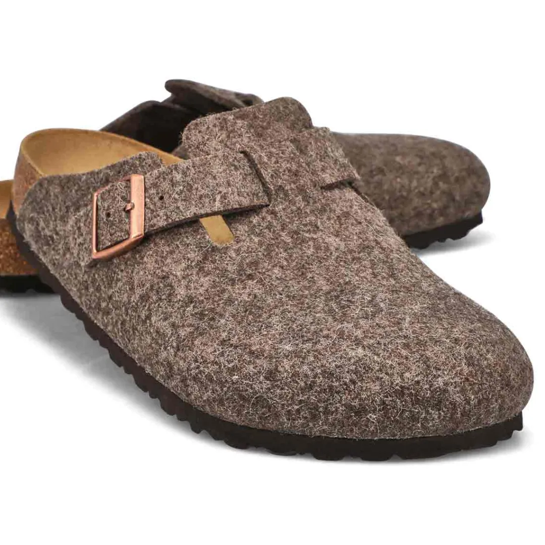 The Boston Wool clog from Birkenstock with a cushioned Contoured cork footbed conforms to the shape of your foot and features pronounced arch support. Durable EVA outsole, cork footbed molds to each individual foot to provide a custom fit. This Birkenstock emphasizing the handcrafted and natural look of stylish clogs. A comfort legend and a fashion staple.