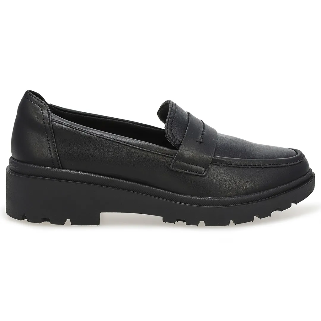 From work to weekend, our Calla Ease loafer from Clarks gives you comfy steps all day long. With an on-trend lug sole and black leather uppers, its chunky profile is still light as a cloud, thanks to a flexible EVA sole and plush underfoot cushioning. With its soft textile sock and upper lining, enjoy fresh feet with feel-good style credentials.