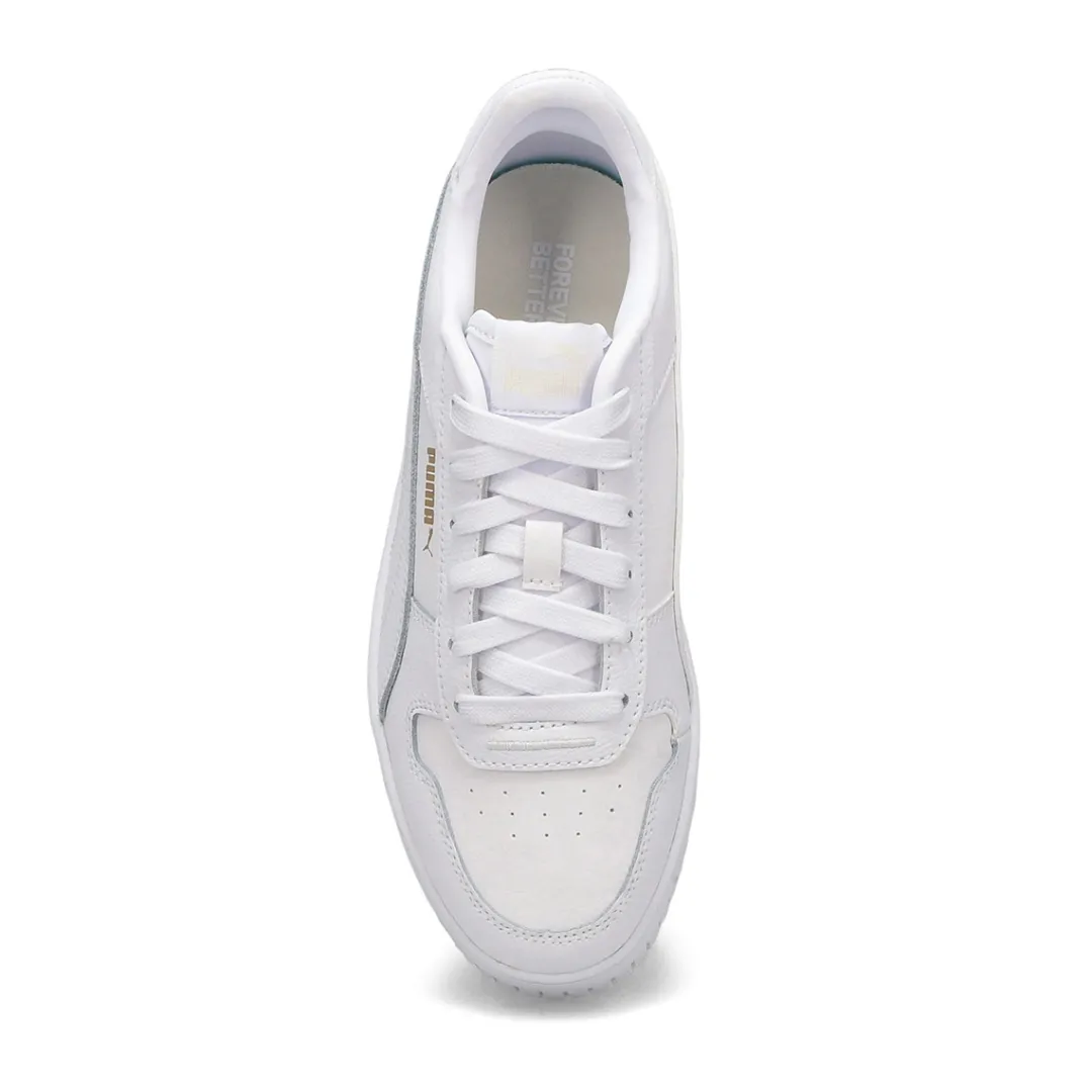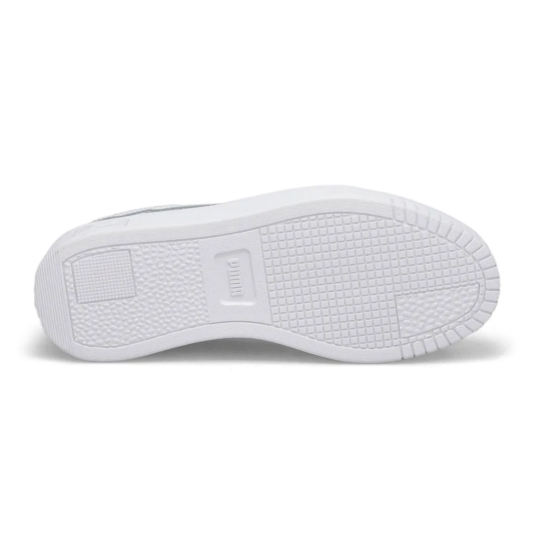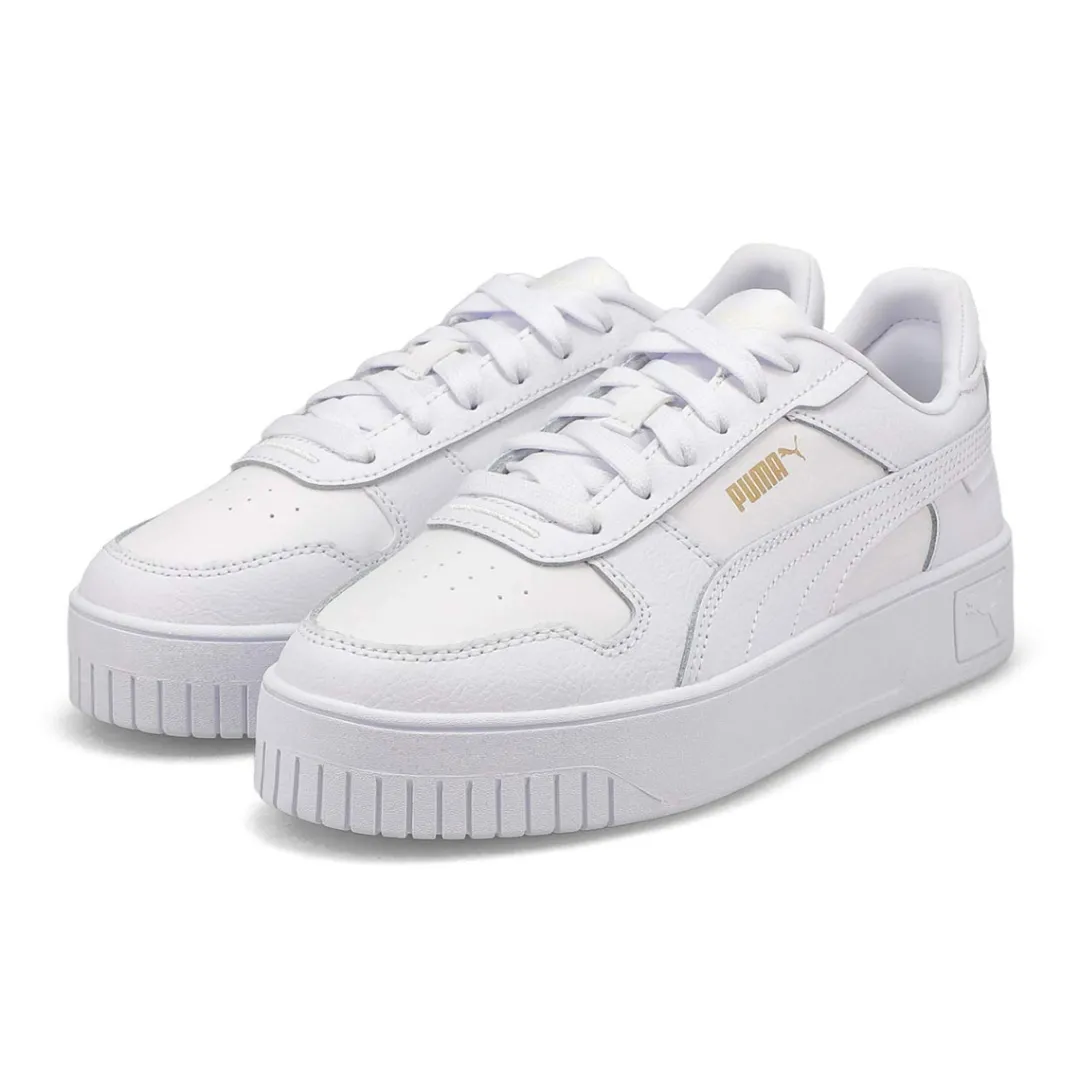 The Carina Street Jr white/ rose sneaker from Puma features a streetwear-inspired design and a slightly elevated platform, making them your perfect choice for casual, everyday outfits. Upper of this shoe is made with at least 20% recycled materials as a step toward a better future. SOFTFOAM+: Step-in comfort sockliner designed to provide soft cushioning thanks to its extra thick heel.