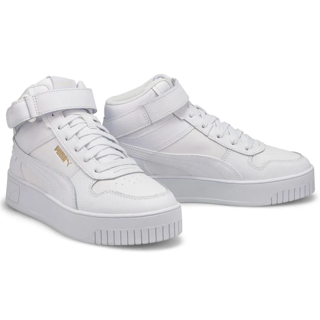 The Carina Street Mid white/ gold sneaker from Puma features a streetwear-inspired design and a slightly elevated platform, making them your perfect choice for casual, everyday outfits. Upper of this shoe is made with at least 20% recycled materials as a step toward a better future. SOFTFOAM+: Step-in comfort sockliner designed to provide soft cushioning thanks to its extra thick heel.