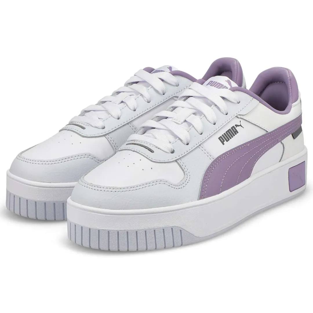 The Carina Street white/ pale plum /silver sneaker from Puma features a streetwear-inspired design and a slightly elevated platform, making them your perfect choice for casual, everyday outfits. Upper of this shoe is made with at least 20% recycled materials as a step toward a better future. SOFTFOAM+: Step-in comfort sockliner designed to provide soft cushioning thanks to its extra thick heel.