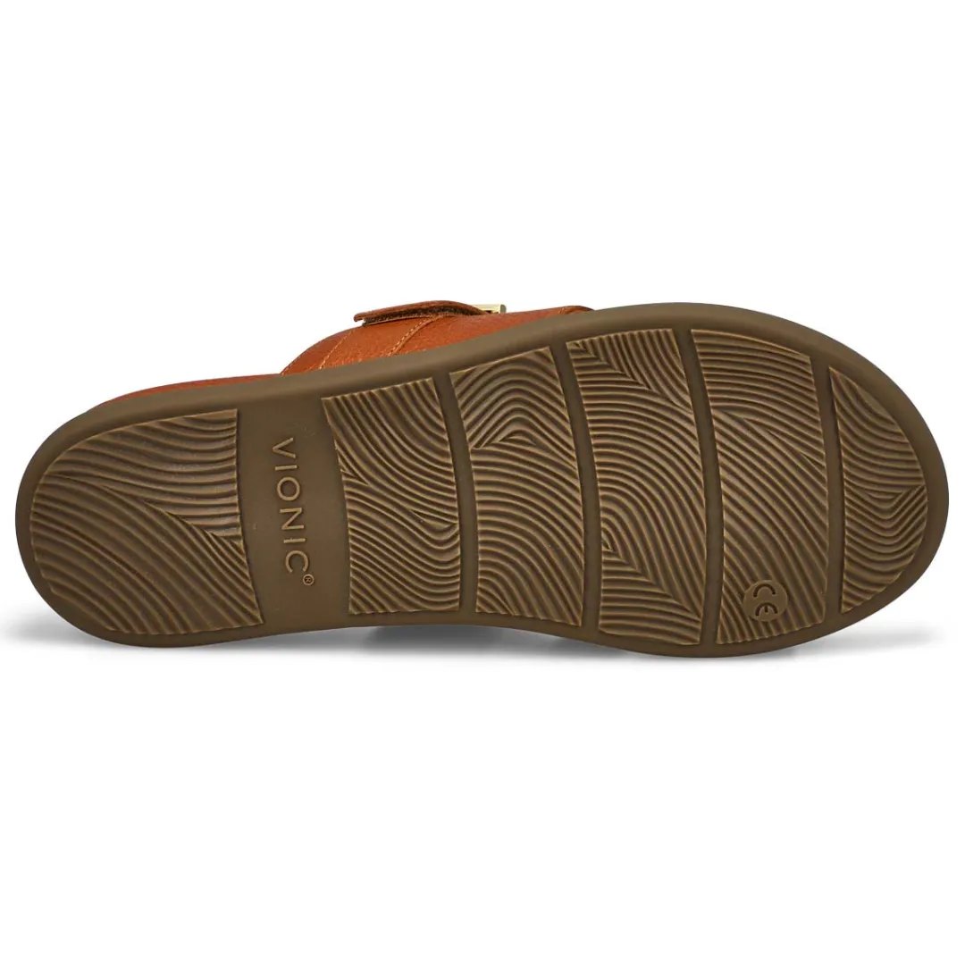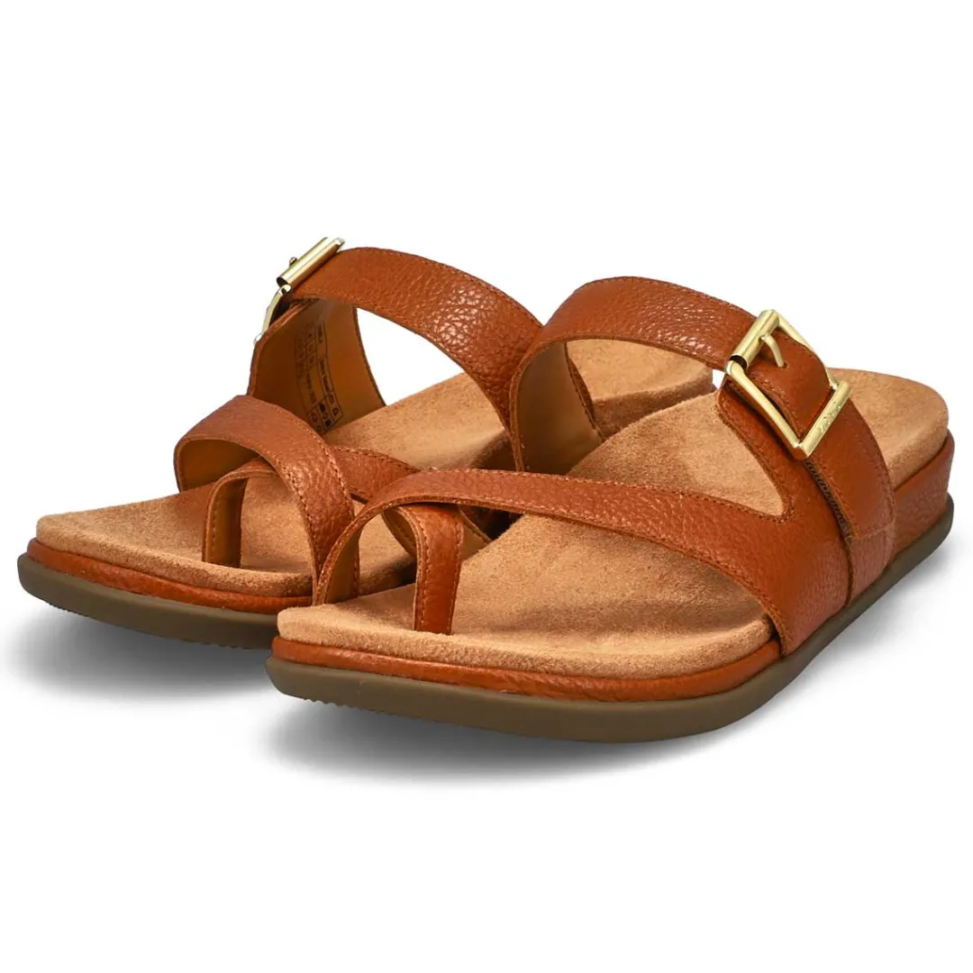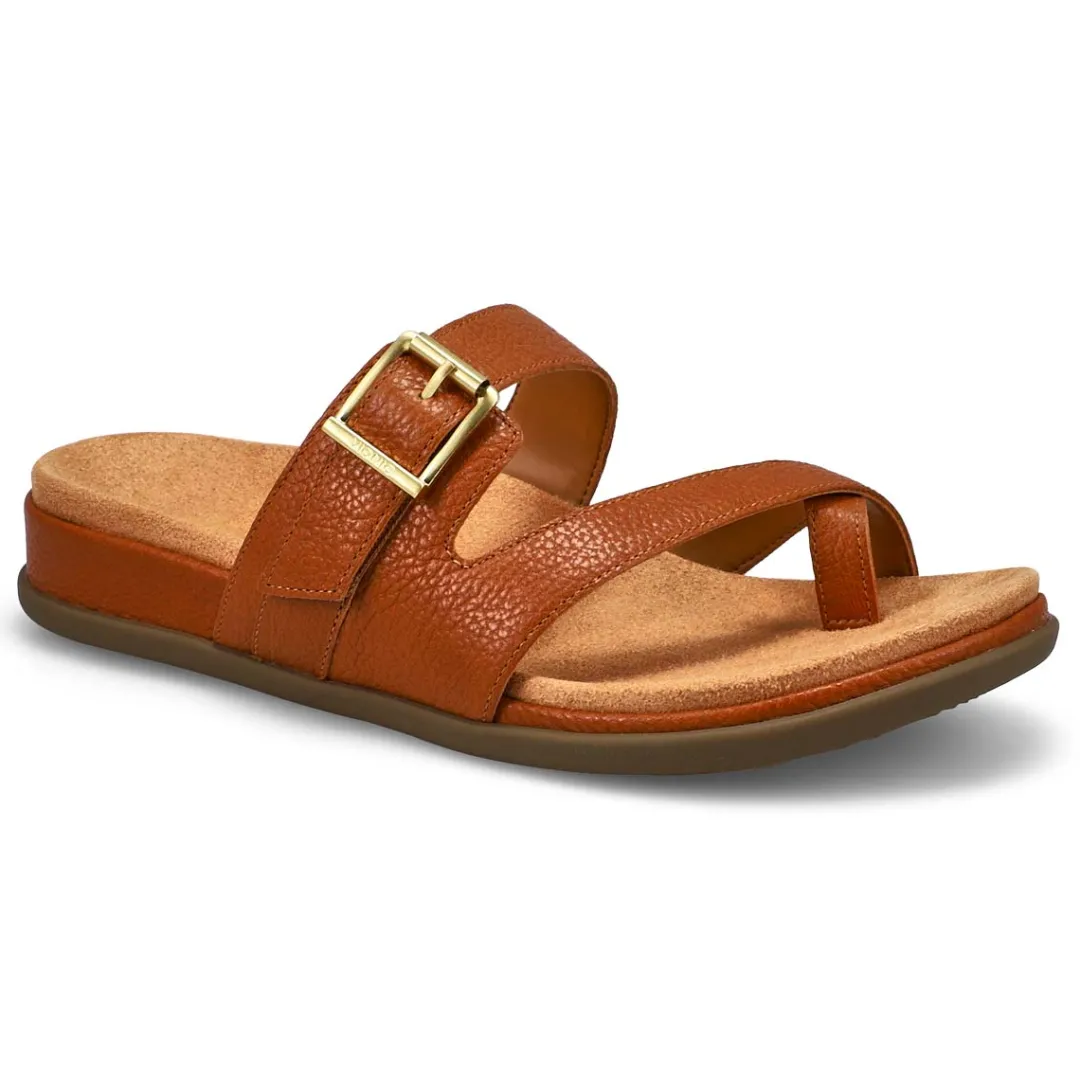 Delight in Carmela toe-post loop sandal with just enough coverage and an adjustable hook-loop strap-wrapped footbed designed for optimal comfort. Designed with exclusive alignment technology to balance the whole you. The Vionic carmela two strap casual tan sandal features a leather upper, microfiber covered EVA footbed, and a durable synthetic outsole.