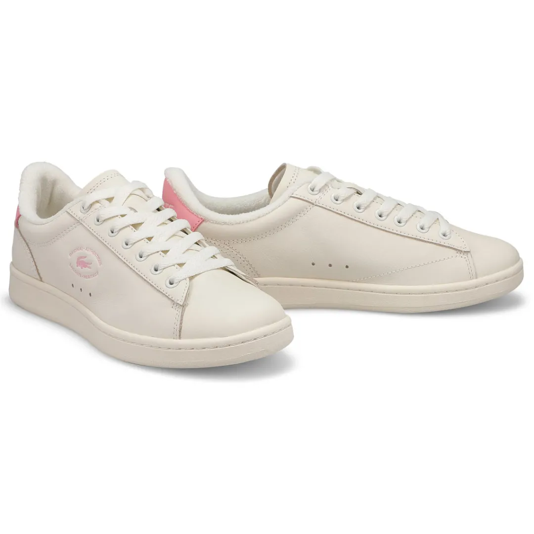 The Carnaby Set is a new, premium take on a Lacoste classic, offering the ultimate in timeless elegance. The Lacoste Carnaby Set Leather white/pink sneaker features minimal lines and a premium leather and suede upper, plus sophisticated finishing touches including a central metallic crocodile. Lining is made with 100% recycled polyester.