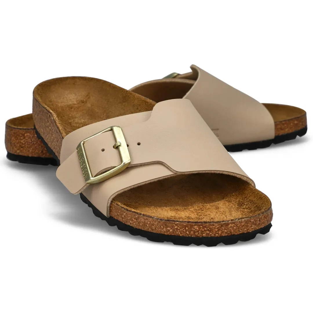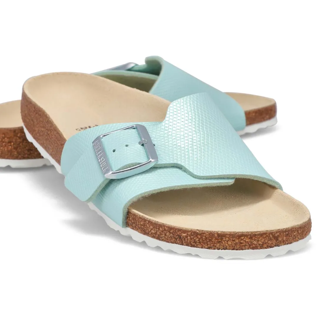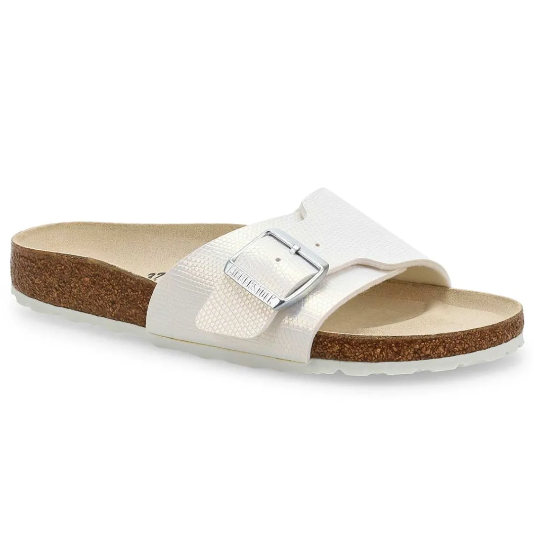 The Catalina Luxe Buckle narrow white sandal from Birkenstock is detailed in embossed, shimmery Birko-Flor with a shiny Luxe Buckle and eyecatching texture. Designed around Birkenstock’s original contoured footbed for support, this one is ready to chase the sun when you are. Suede footbed lining helps keep you comfortable. Adjustable strap with oversized Luxe Buckle. Made in Germany. Narrow Width.