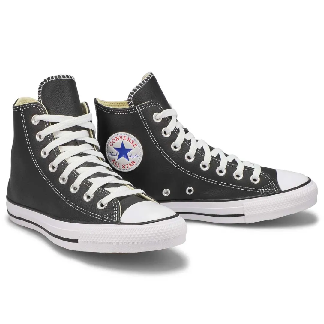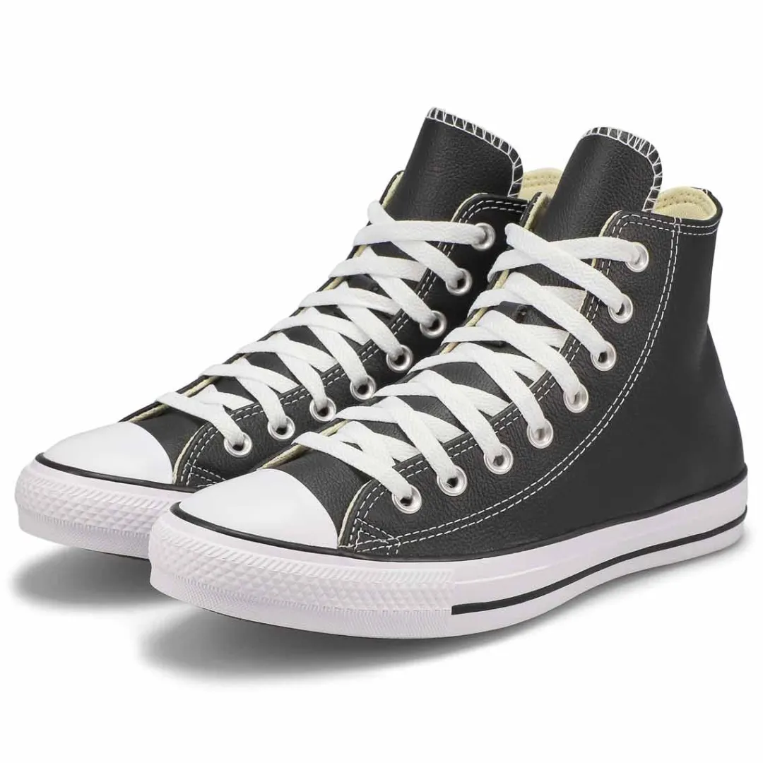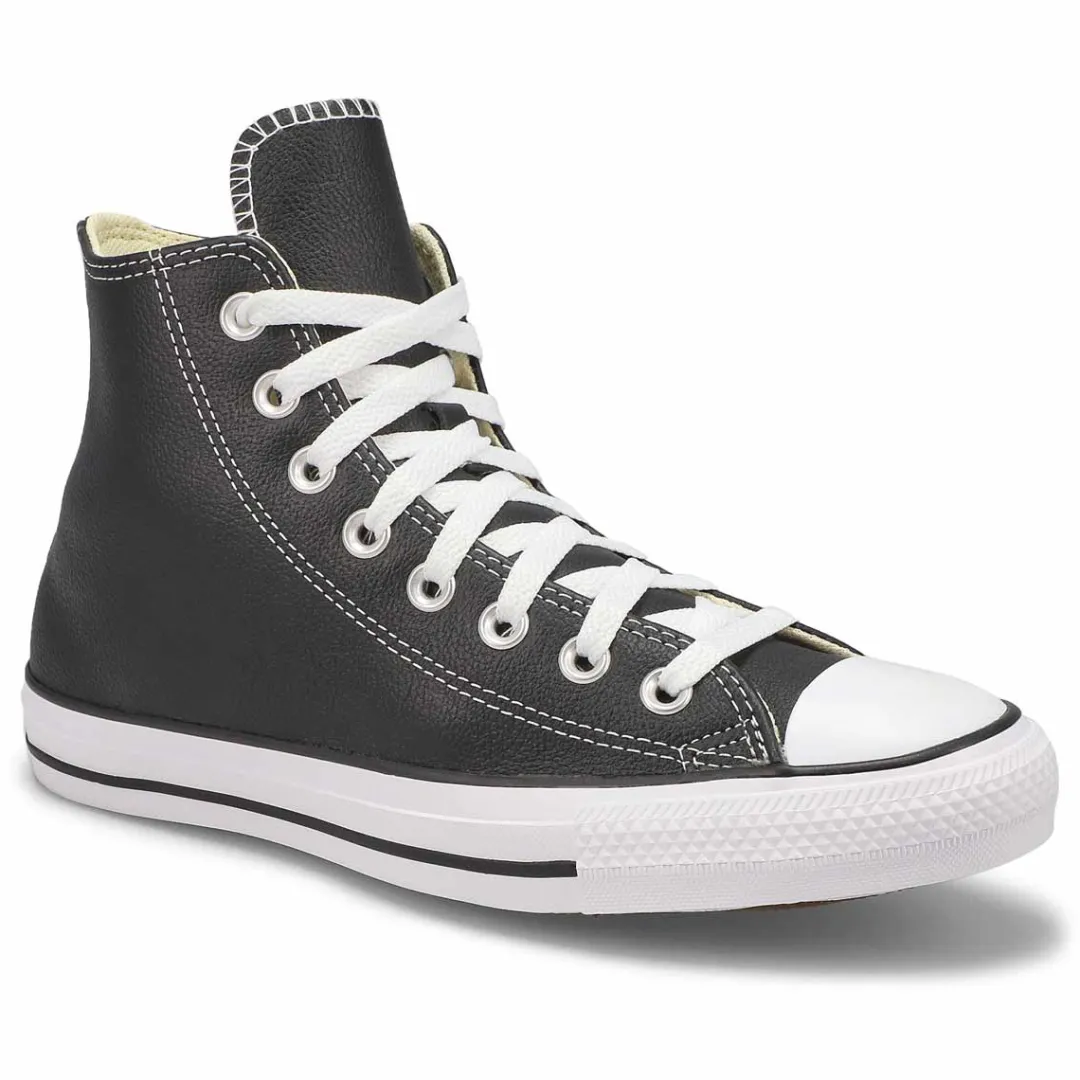 The original hi top basketball shoe, now a defined style of its own! The Chuck Taylor All Star Leather by Converse is the perfect black hi top sneaker for everyday wear. This go-to staple has super-soft luxe leather, vulcanized rubber sole for traction and the classic All Star ankle patch. Time to write your own story in a pair of these sneakers.