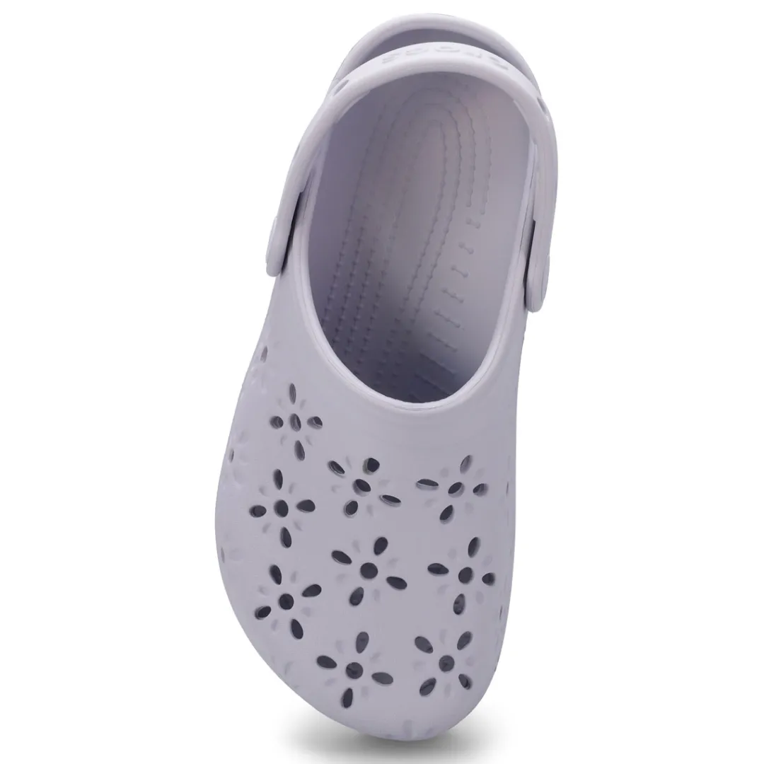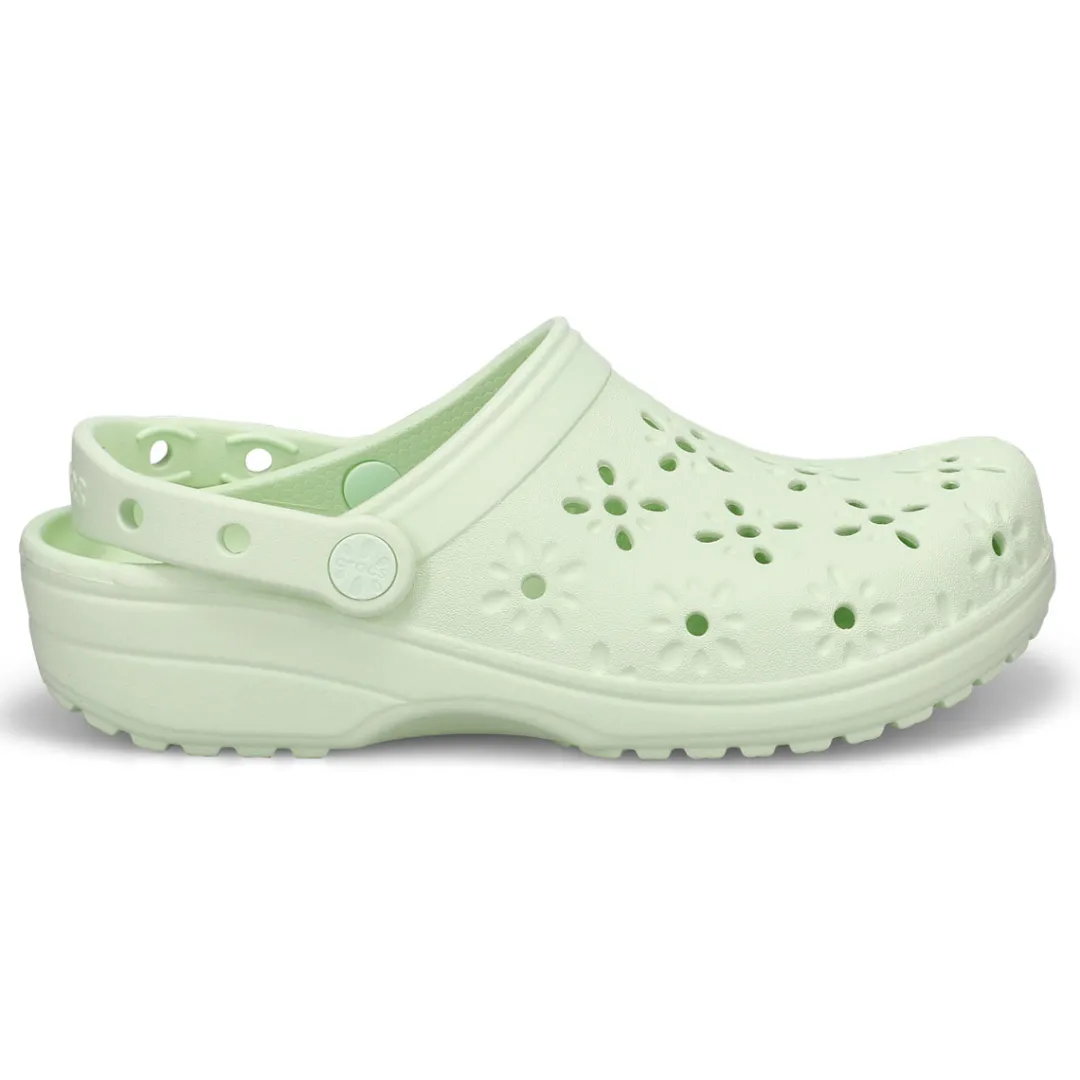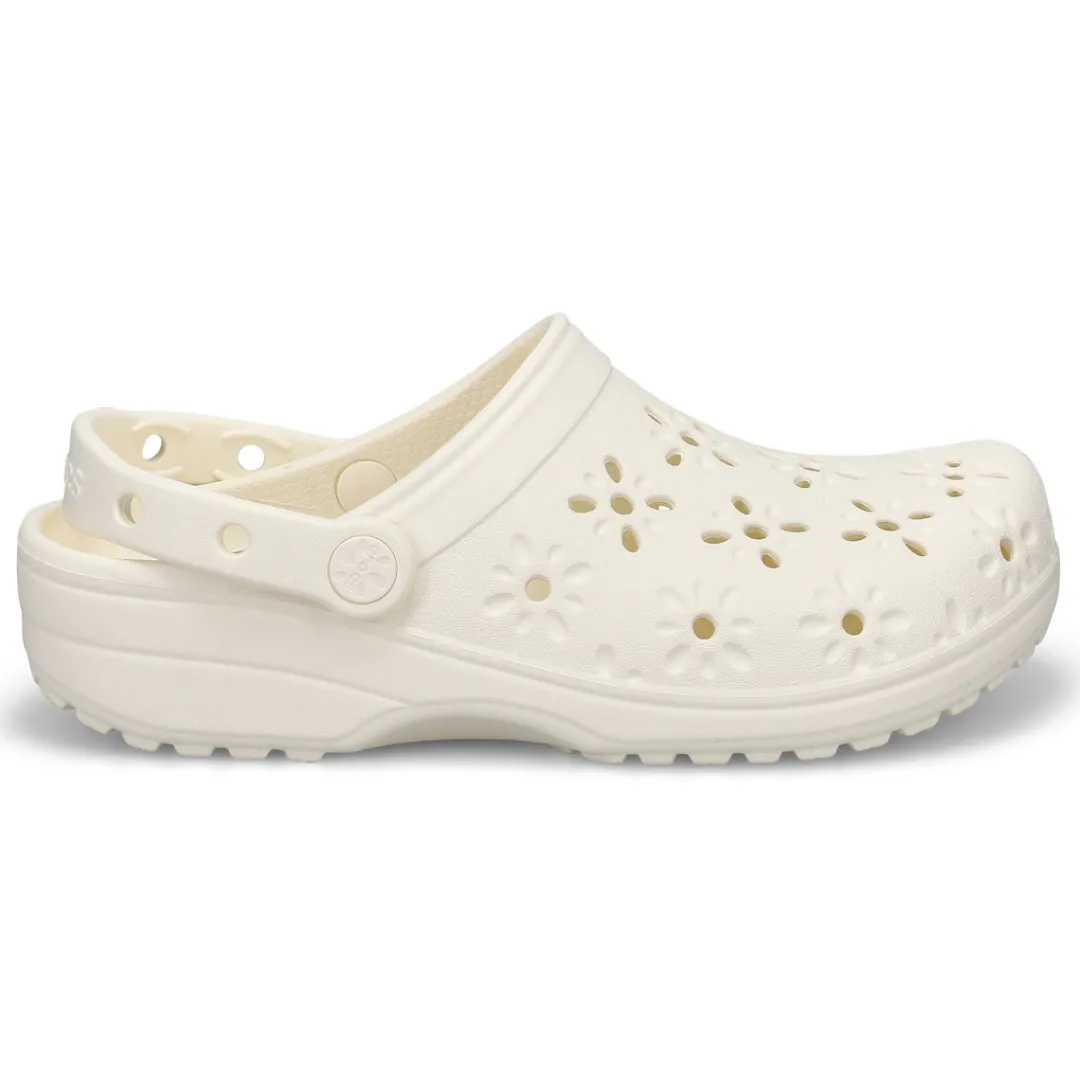 The Classic Clog with a fresh, new twist! This new evolution of Crocs clog features floral-inspired cutouts that provide a joyful, fun look, plus matching floral rivets that unify the design. You’ll still enjoy the fully-molded lightweight construction and iconic comfort of the original, and you can still add personalization with Jibbitz charms. It’s the irreverent, go-to comfort shoe that you love — now with a fun, floral update!