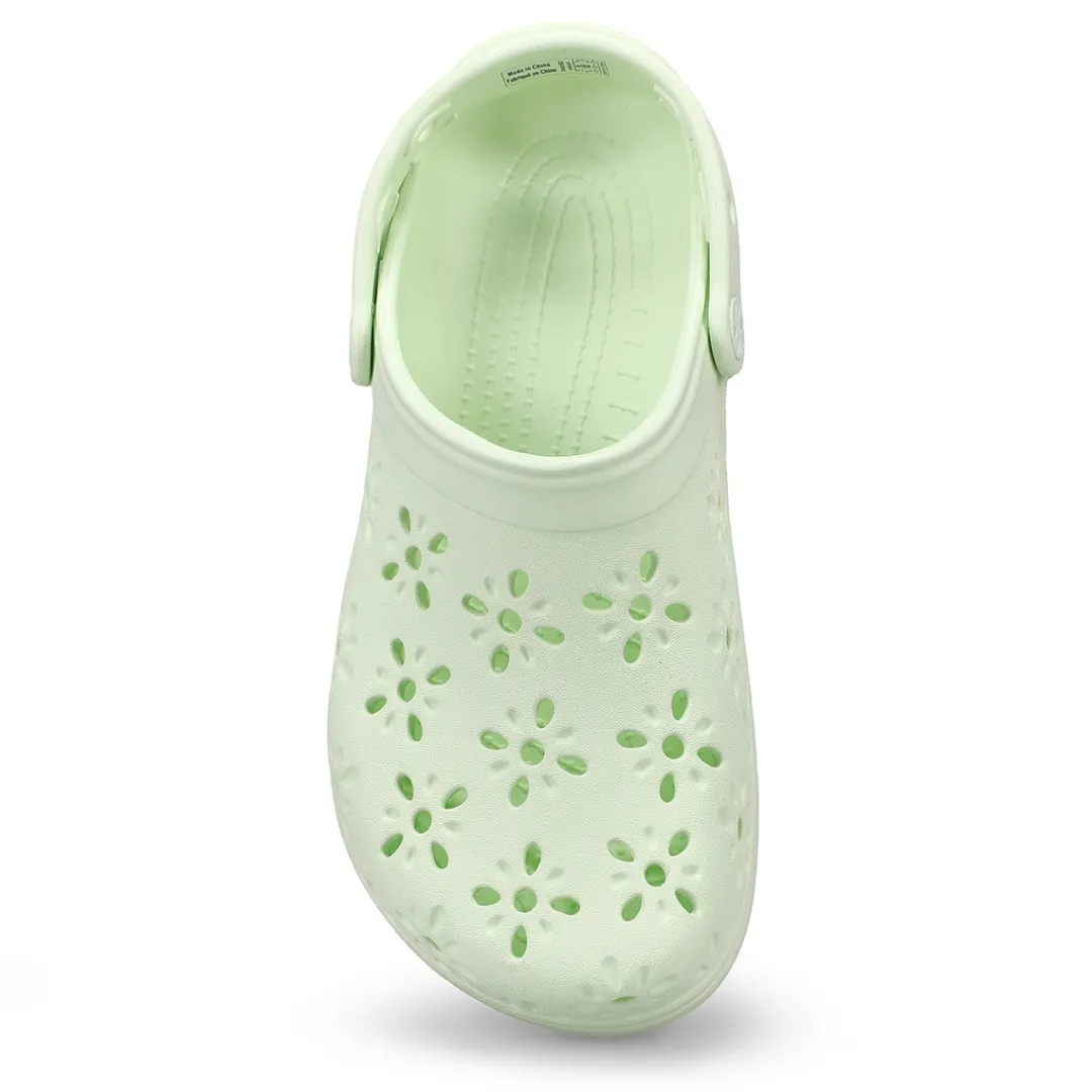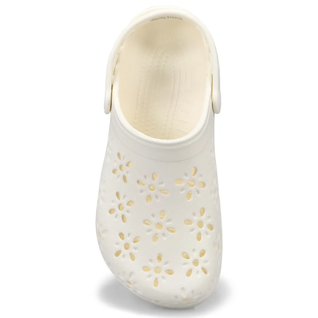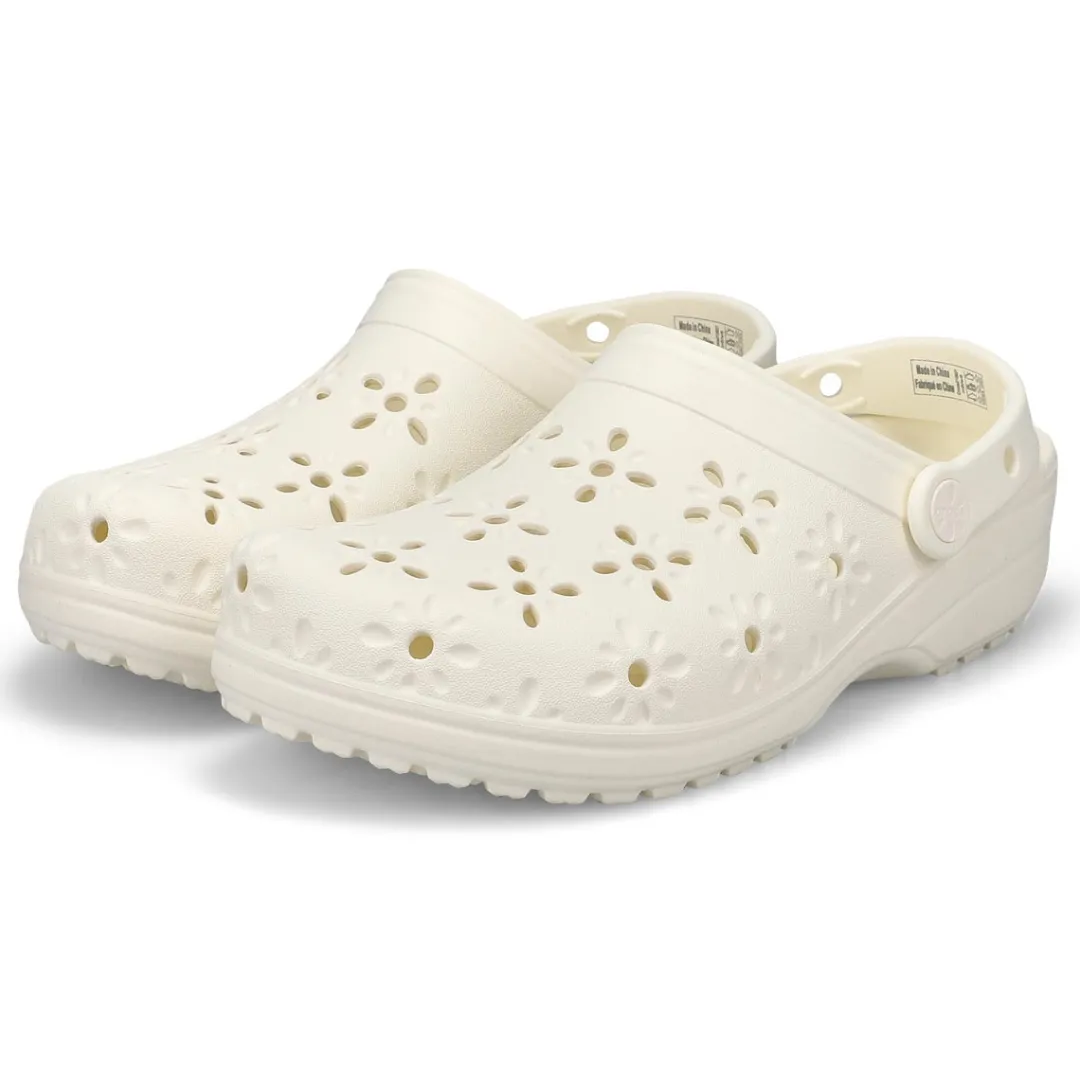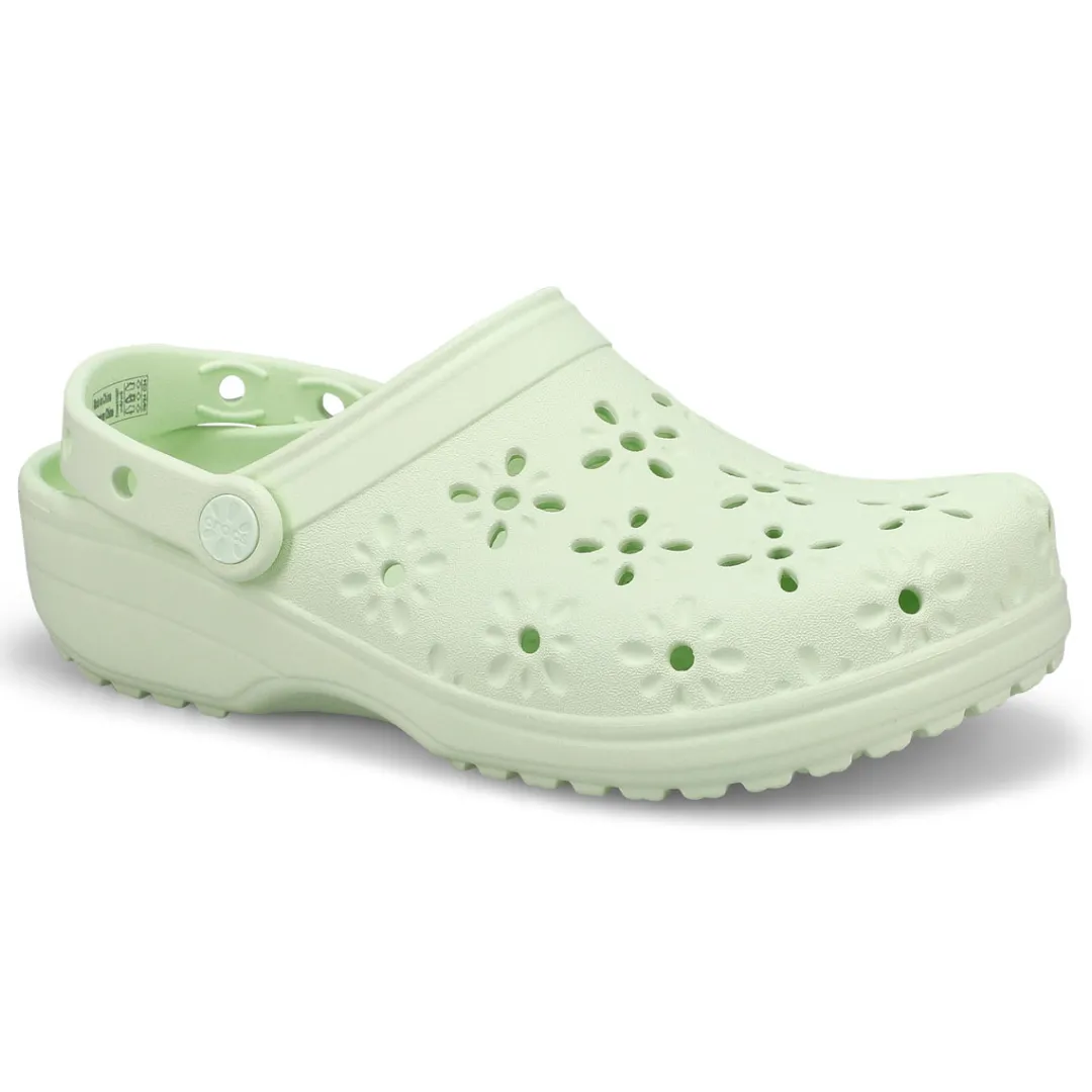 The Classic Clog with a fresh, new twist! This new evolution of Crocs clog features floral-inspired cutouts that provide a joyful, fun look, plus matching floral rivets that unify the design. You’ll still enjoy the fully-molded lightweight construction and iconic comfort of the original, and you can still add personalization with Jibbitz charms. It’s the irreverent, go-to comfort shoe that you love — now with a fun, floral update!