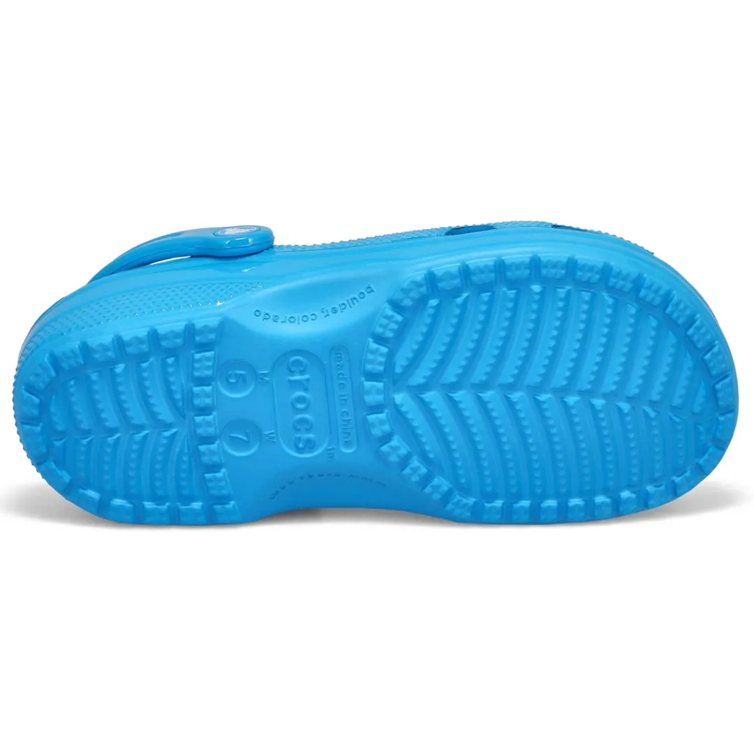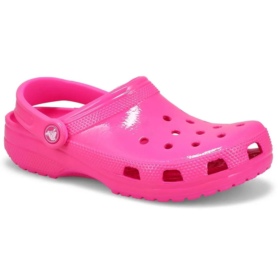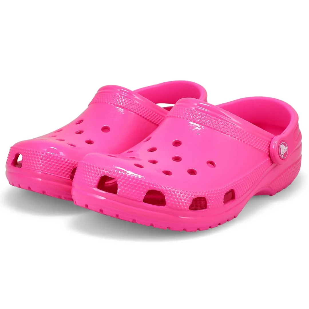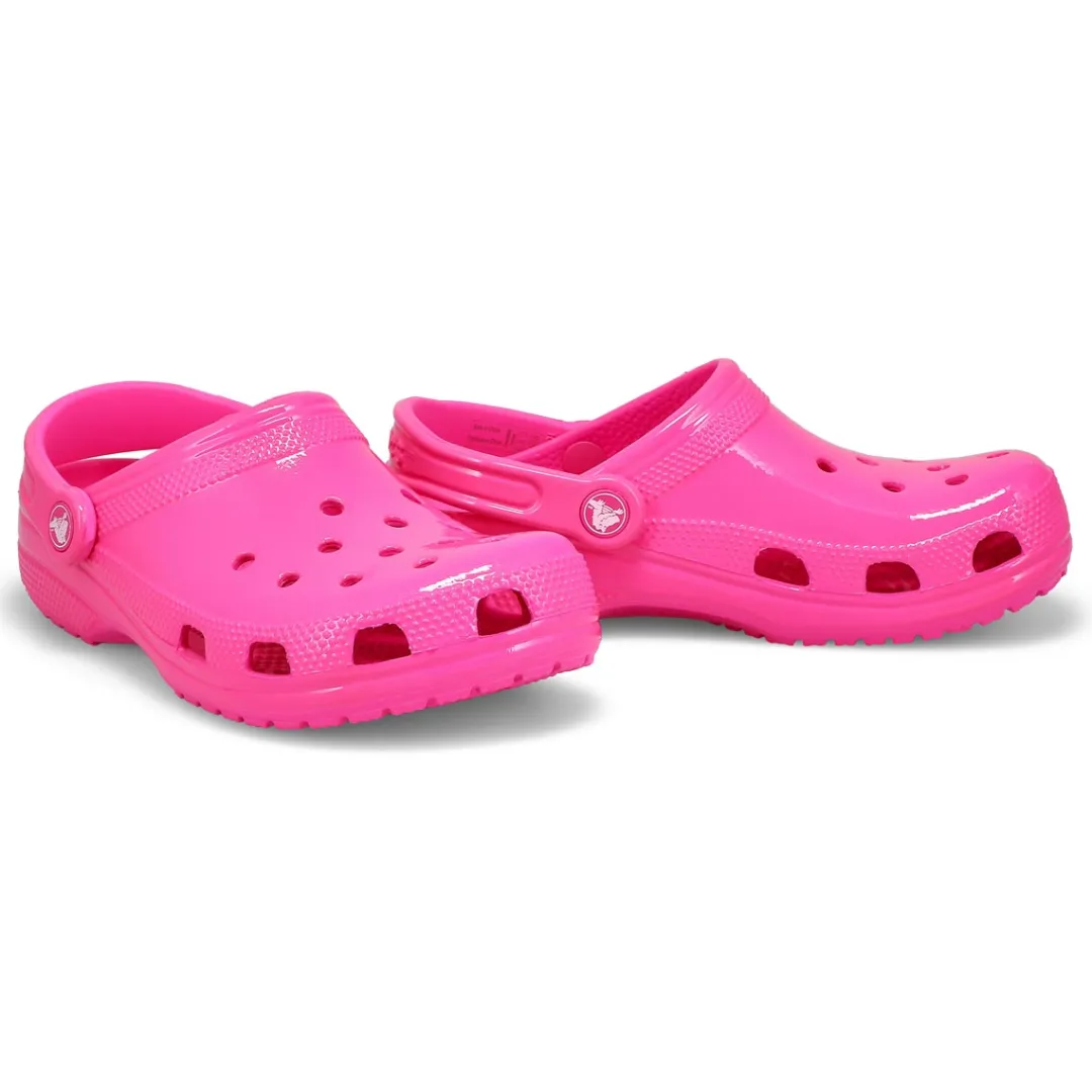 The Classic Neon Highlighter pink crush clog from Crocs delivers shiny neon colors that provide extra style to this version of the iconic clog. The fun neon colors and super high shine new treatment help you show off your creative spirit, and Croslite foam construction keeps them light and easy to wear. Grounded in comfort, spiked with personality.