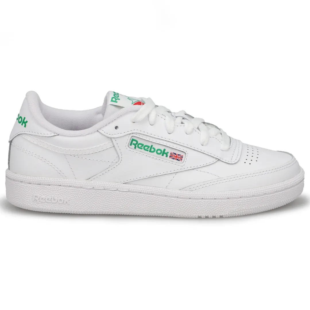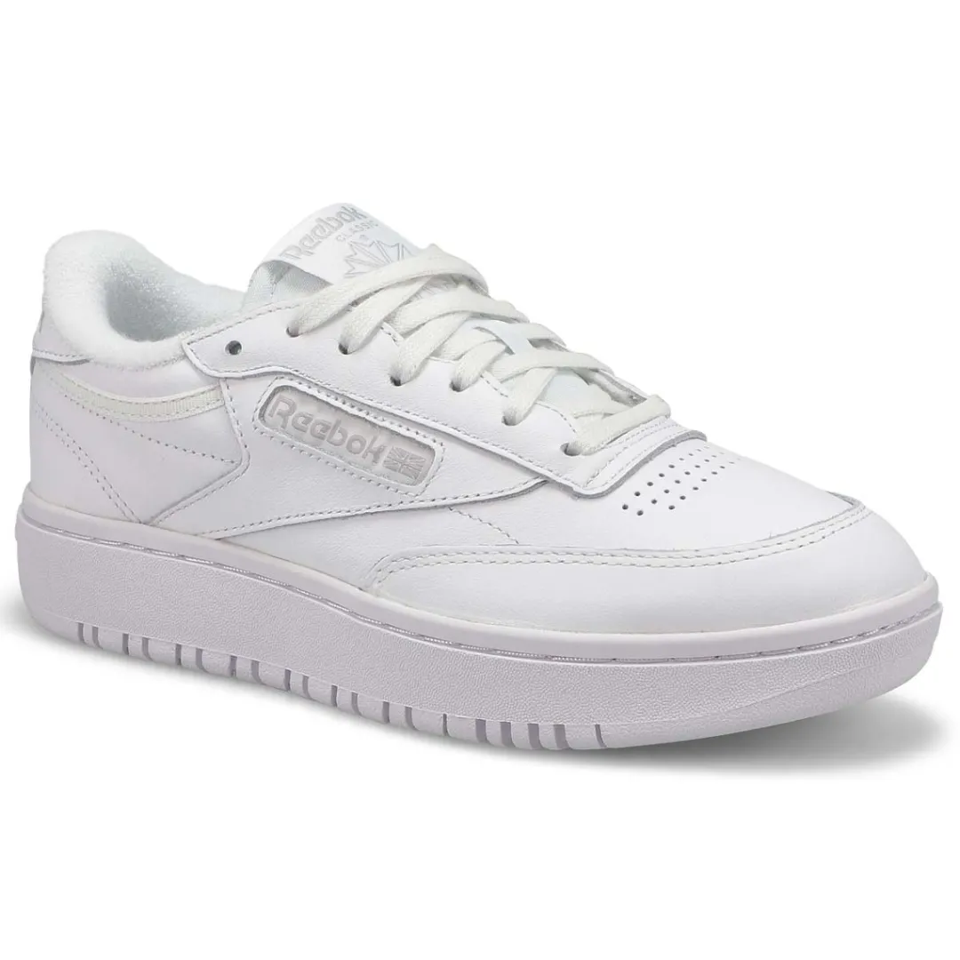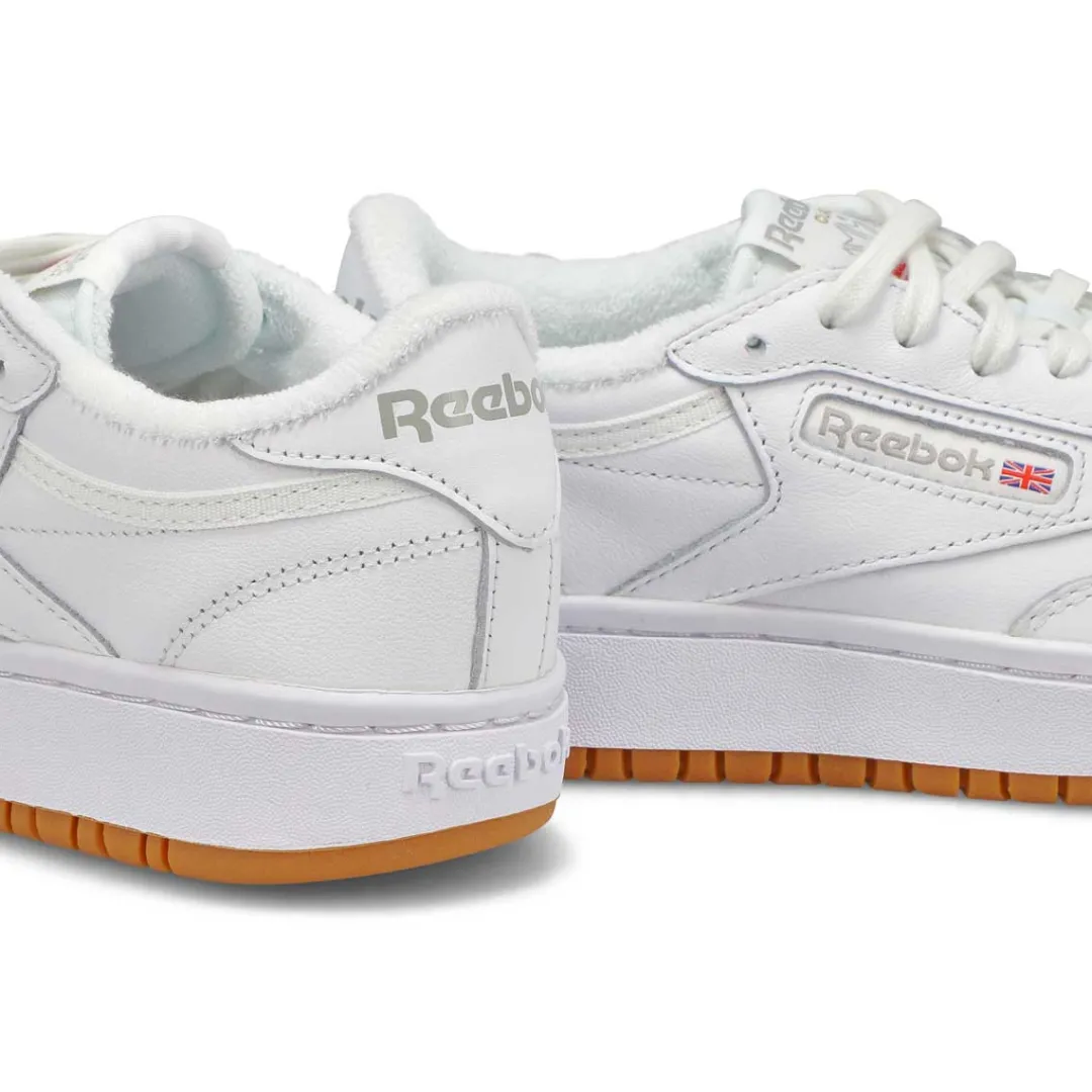 Clean, minimalist design. The Club C Double white/ gum tennis-inspired shoes from Reebok keeps your look sleek and simple. Pops of subtle contrast color adds a chic touch. A Reebok logo window with a Union Jack gives them old-school style. The upper is made of soft, flexible leather. Stacked midsole for extra height and a chunky profile.There’s nothing quite like a fresh white sneaker!