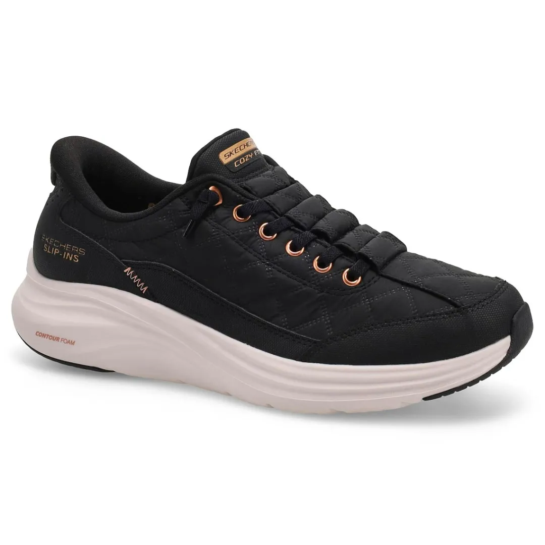 PUFFER FIT Step into plush luxury and cozy comfort with Hands Free Slip-ins Contour Foam – Cozy Fit Golden Hour Sneaker from Skechers. Designed with their Heel Pillow, this slip-on style features a quilted Cozy Fit and duraleather overlay upper with tied-off stretch laces, Contour Foam midsole cushioning, and Skechers’ signature cushioned Skechers Air-Cooled Memory Foam insole.