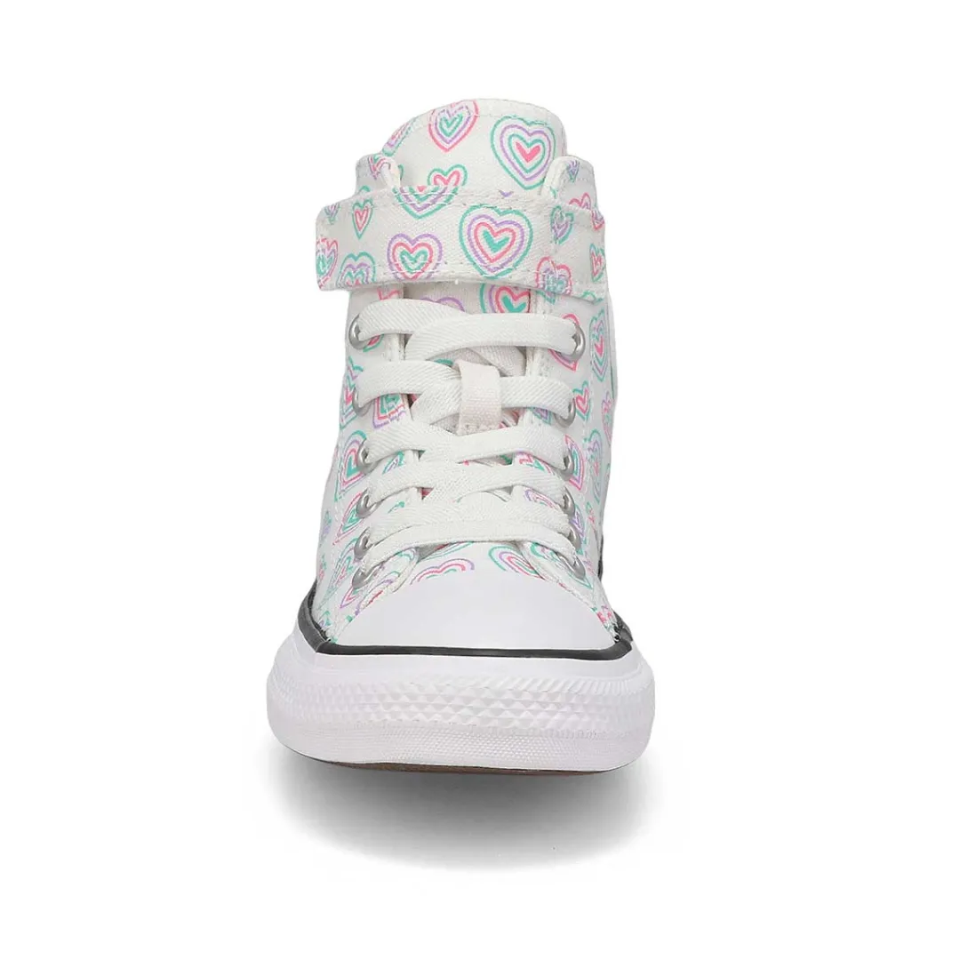 Let your kid’s summer style shine with classic Chuck Taylor All Star 1V Happy Hearts sneaker from Converse. The iconic high top gets redesigned for kids, with a cushioned SmartFOAM sockliner, softened stitches and linings, and one hook-and-loop strap for easy on and off. The All Star 1V look gets complemented by Chuck Taylor All Star classics, like a star ankle patch, contrast stripes, and diamond pattern outsole.