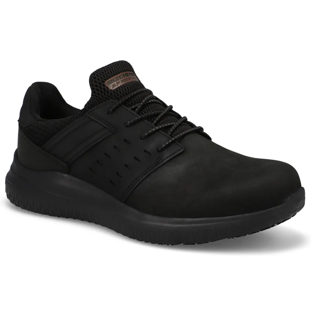 Surefooted comfort and safety gets delivered in the Skechers Work Delson 3.0 SR black slip resistant sneaker. This pull-on features a leather and synthetic upper with stretch laces, Featuring Skechers Air-Cooled Memory Foam insole. Shock-absorbing flexible midsole and rubber traction outsole. Slip-resistant outsole. Electrical Hazard (EH) safe design tested ASTM-F2892
