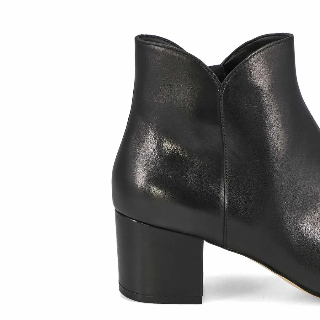 The Elyse leather black ankle boot from Cole Haan have been crafted in soft leathers for the perfect fall look. The asymmetrical top-line and tappered-toe combine for a look that’s both edgy and elegant. Featuring a wrapped block heel for effortlessly chic style. Side zipper for an easier on and off. 2½ i-inch covered block heel.