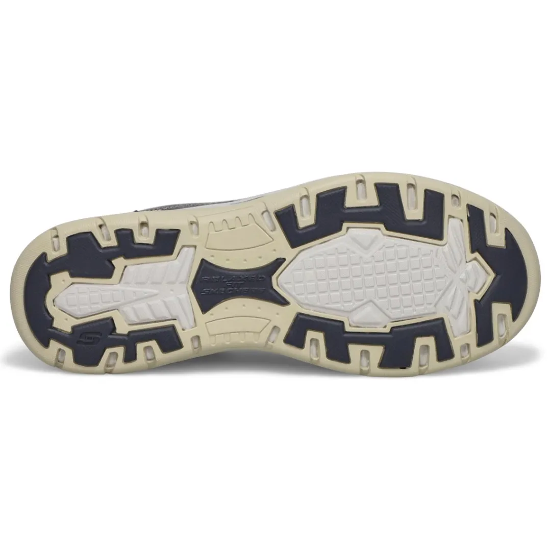Find your island of style and comfort with the Avillo slip on black casual shoes from Skechers. Featuring a soft woven canvas fabric upper. Stitched seam moc toe front. Dual side deep elastic fabric panels with a padded collar. Slip on casual comfort loafer design. Relaxed Fit design for a roomier comfortable fit.