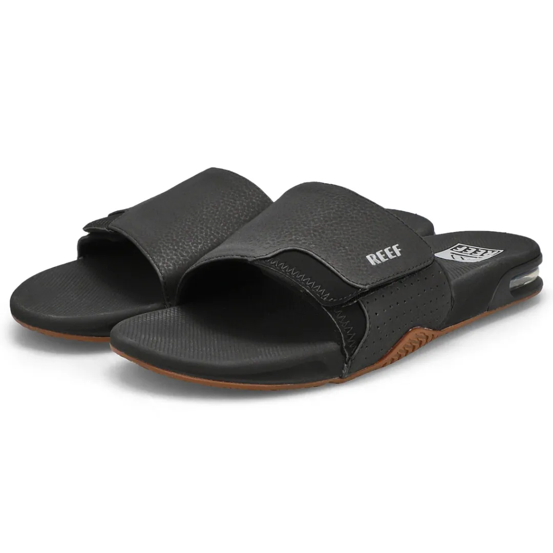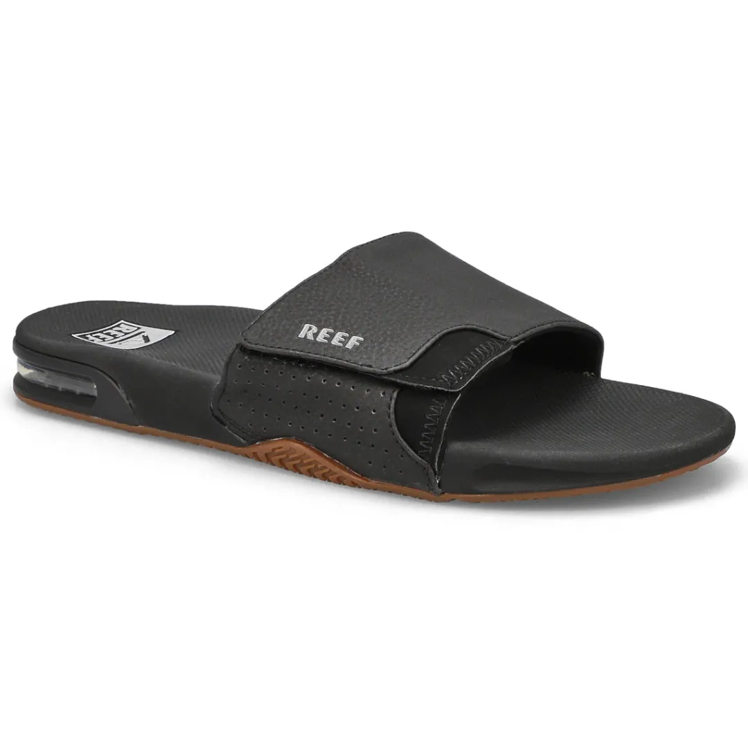 The Fanning black/silver slide sandals from Reef are a classic staple of supreme beachside style! Water-friendly synthetic upper. Contoured compression molded EVA footbed with anatomical arch support. Full 360 degree heel airbag enclosed in soft polyurethane. Church key to open your “soda” bottle. Reef icon herringbone rubber outsole design.