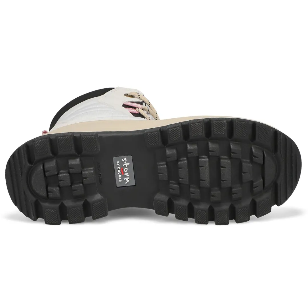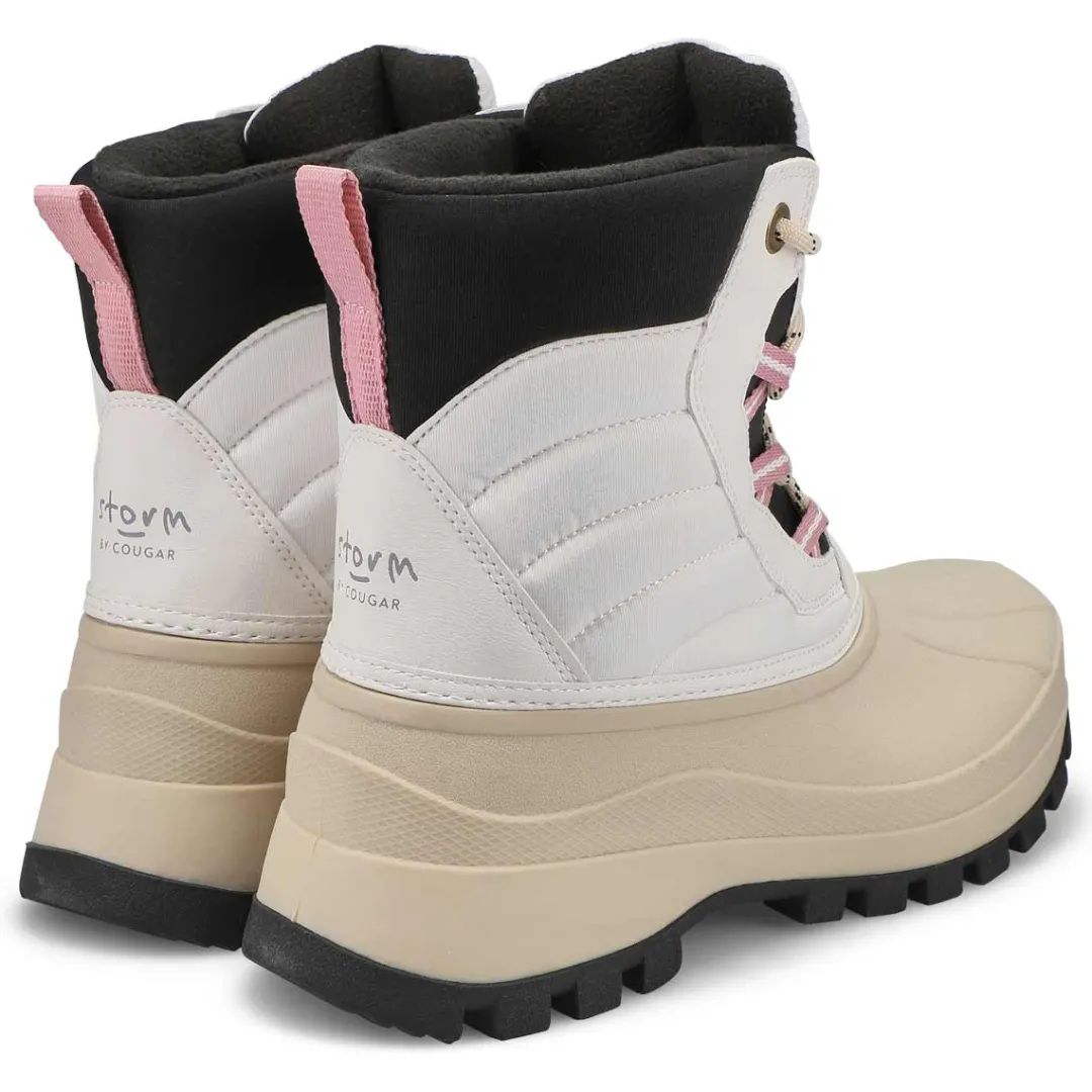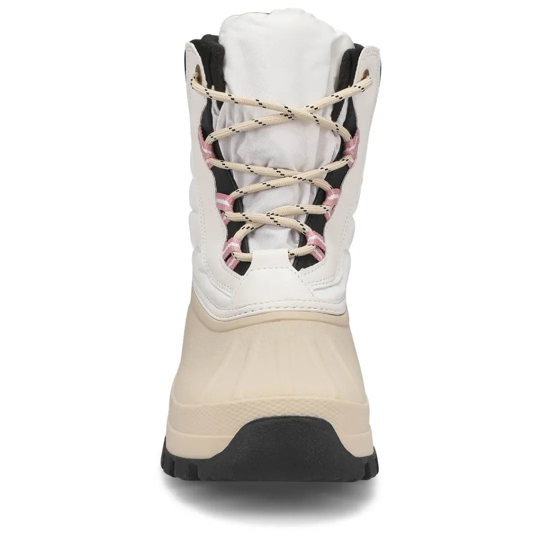 The Fiska Waterproof oyster white winter boot from Cougar is a mid-calf, light-weight nylon and synthetic winter boot. Featuring a rounded toe and front lace closure for a secure fit. Polar plush lining with Thermolite Insulation. Polar fleece lining surrounds the foot in soft comfort. Slip-resistant, Thermoplastic rubber outsole with lightweight EVA midsole.