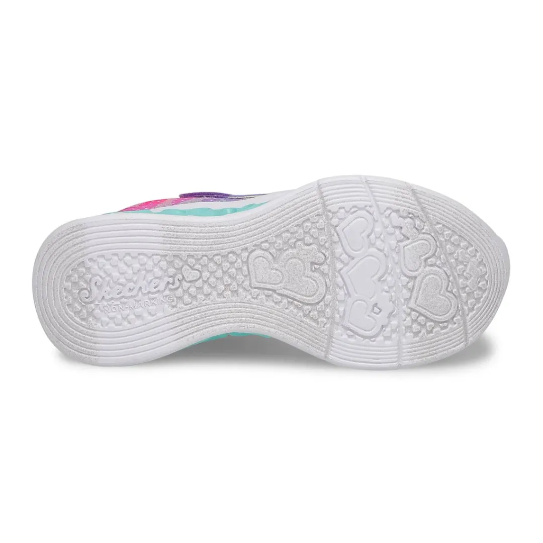 Illuminate your style with feet-loving comfort in Flutter Heart Lights lavender/ multi sneaker from Skechers. This lightweight slip-on features a multicolor leopard print fabric and glittery synthetic upper with a fun 3-D heart-sculpted light-up midsole. Slip-on style with instep strap and stretch laces. Bigger kids’ sizes feature on/off light switch.