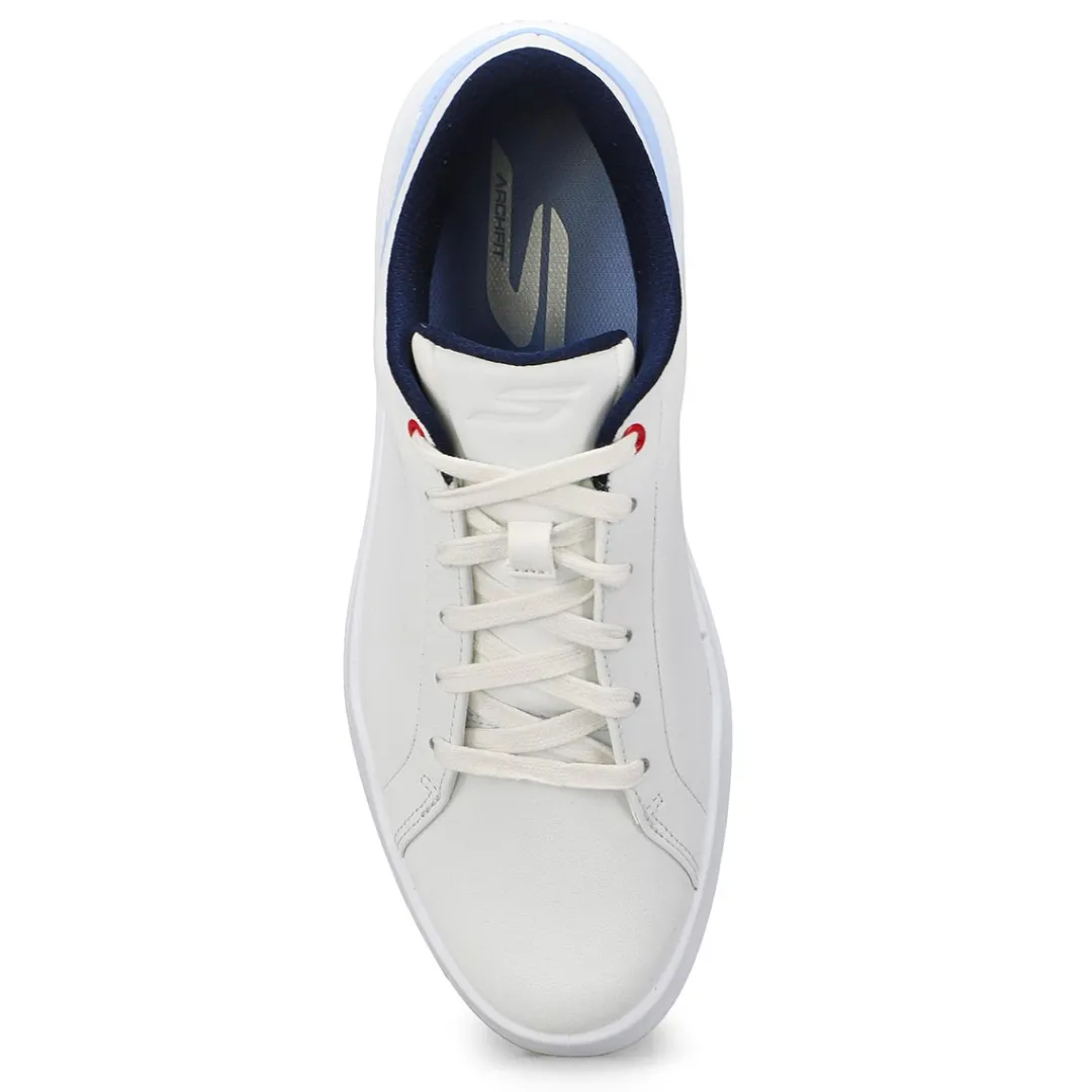 Win every round in sleek, durable comfort wearing Relaxed Fit: GO GOLF Drive 6 white/ light blue lace up golf shoe from Skechers. This spikeless waterproof design features a premium full-grain leather upper with a lace-up front, removable Arch Fit supportive insole, and a stabilizing Goodyear Rubber Outsole that delivers enhanced traction, stability, and durability.