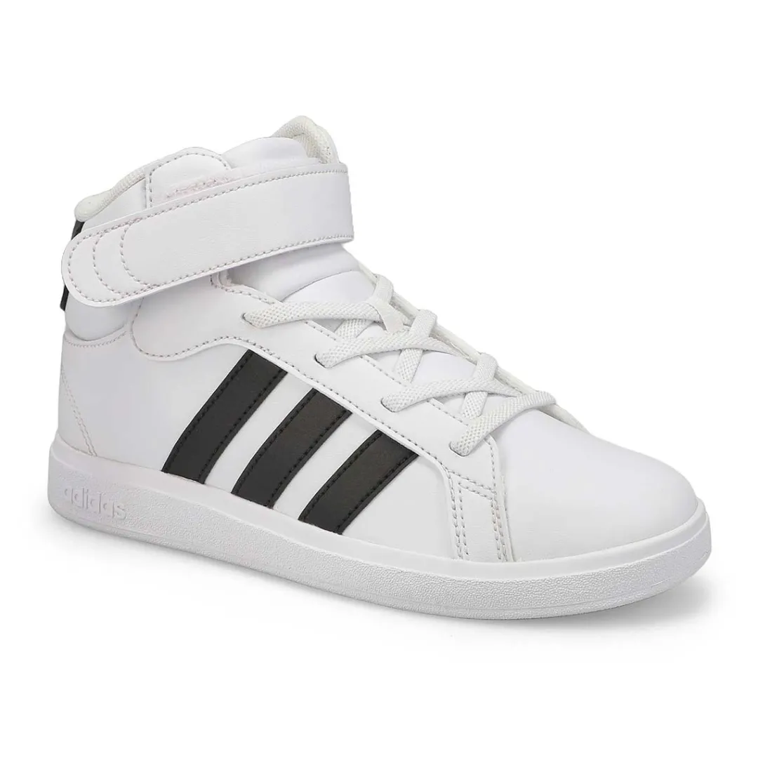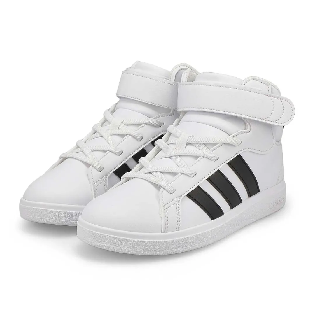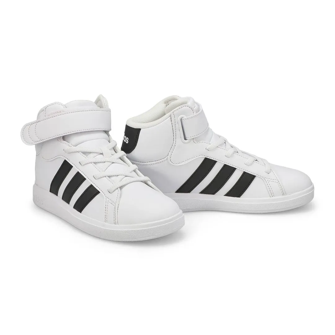 They will enjoy the heritage looks and prolonging comfort of these Adidas Grand Court Mid K white/black sneaker from Adidas. Boasting of a durable synthetic leather upper with signature 3-stripes, these athletic sneakers have a secure lacing system with a hook and loop top closure, Cloudfoam Comfort sockliner and flexible rubber sole. Your little one will stand out among the crowd!