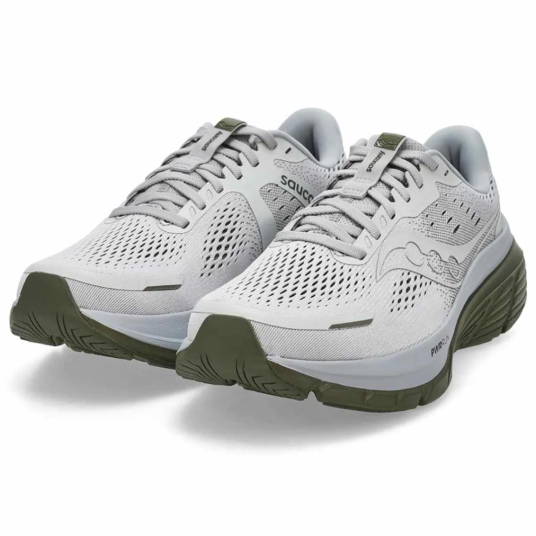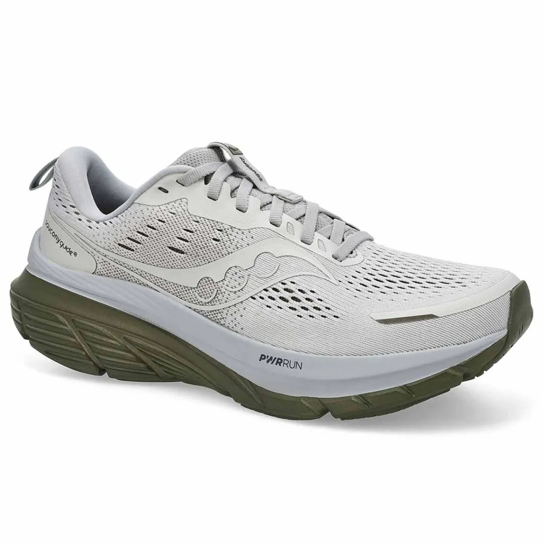 Run with Confidence. The Guide 18 cloud/ olive Performance Sneaker from Saucony elevates comfort to new heights with enhanced PWRRUN cushioning, providing more protection than ever before. The innovative CenterPath technology ensures you stay secure and confident with every step.This daily running shoe also features a redesigned upper with breathable mesh for improved airflow and a padded heel collar for a snug fit. Go further with the Guide 18.