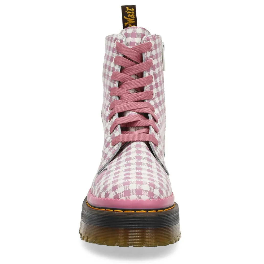 Stand tall. Stay playful. The Jadon Heart 8-eye boot from Dr. Martens’ , turns six decades of Doc’s DNA into a bold, head-turning platform. Crafted from white Smooth leather, it’s ready to be polished or scuffed exactly how you like. Flat dusty rose laces, satin-padded hearts, and a dusty rose gingham print bring a joyful twist to the classic silhouette, while a white scalloped rand adds subtle texture above the welt.