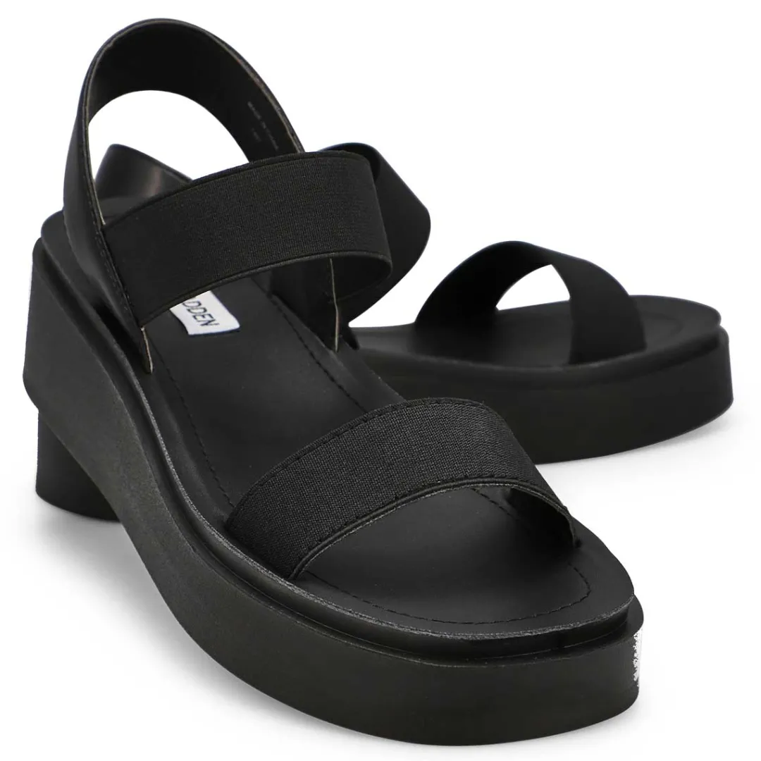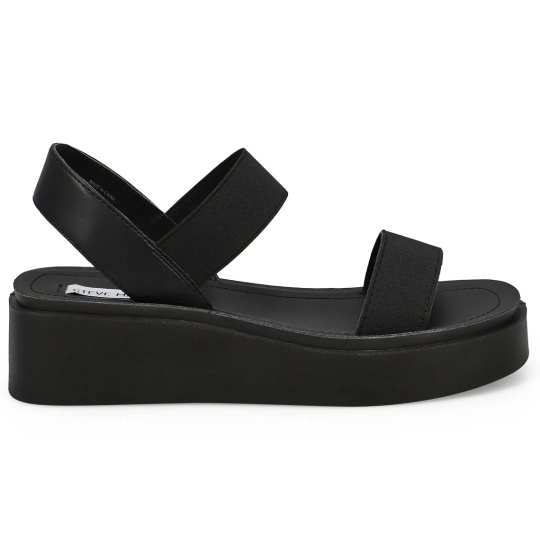 Perfectly simple and as classic as they come, the Janice black fashion sandal from Steve Madden features a leather upper with elastic upper material. Slip yourself into this timeless style to complement practically any warm weather look and show off your latest pedi! Platform styling, approx, 1.75 inch heel height.