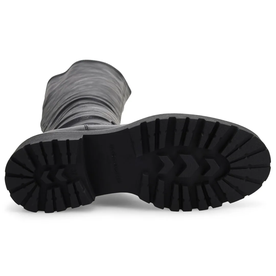 The Kenova black Tall Riding Boot from Vagabond Shoemakers, brings a refined look to this season’s chunky silhouettes. Crafted in smooth black leather, the minimalistic upper is paired with sturdy rubber outsoles measuring 40mm for a subtle lift. The knee-high design is equipped with inside zippers and heel loop tabs for easy wear and removal.