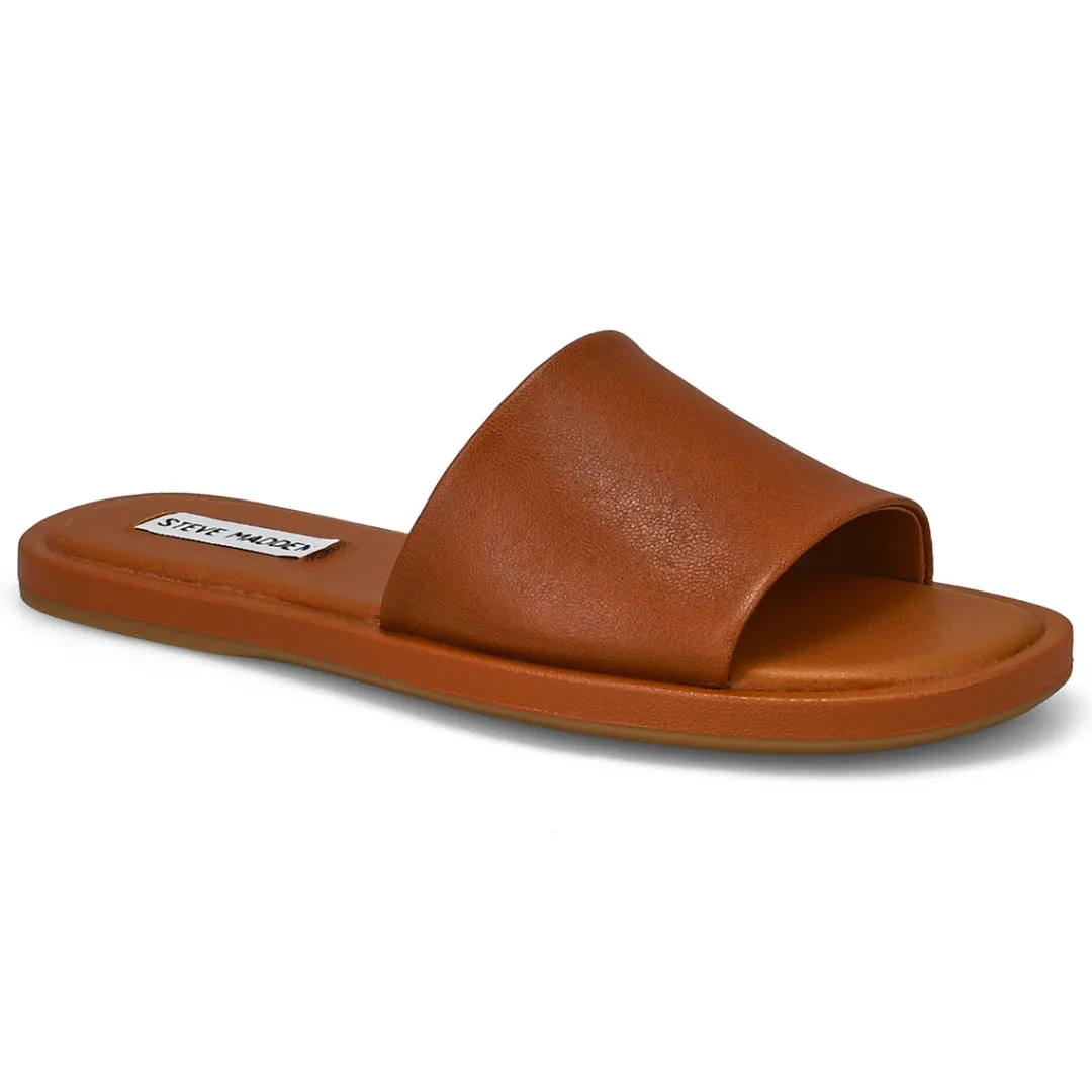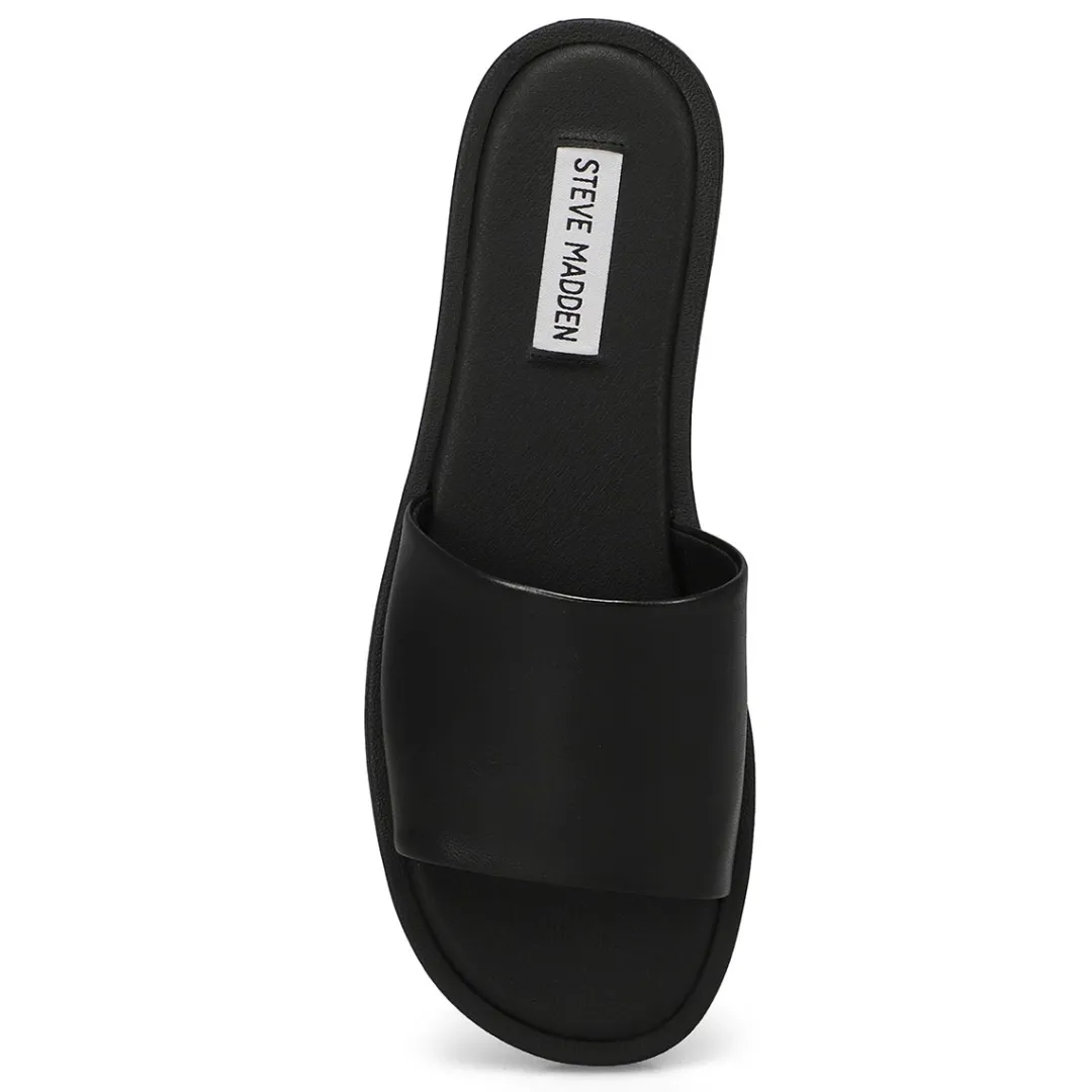 For versatility, style and comfort, Steve Madden has you covered with the Kora black slide sandal. Features a genuine leather upper. Slip on construction for easy on /off. Padded footbed for all day comfort and a flexible rubber outsole for great durability. The Kora slide is a must have for your wardrobe this season!
