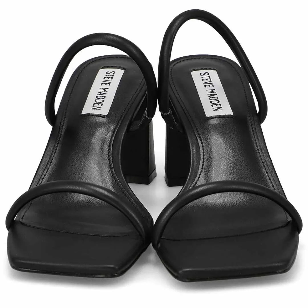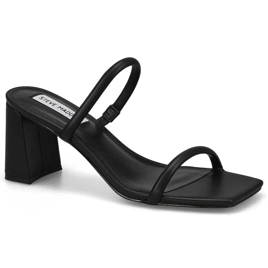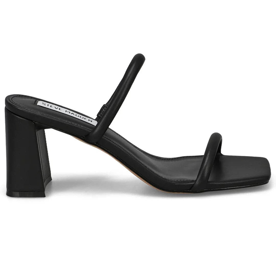 The minimalist Linza black dress heel sandal fromSteve Madden uses 2 slender straps and finishes with a wide square toe. Elevate your warm-weather wardrobe with these beautiful dress heel sandals. Made with PU upper, these vegan material sandals are designed with a synthetic footbed and durable synthetic outsole with block heel.